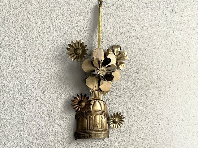 『PRINTEMPS』の文字が入ったヴィンテージオーナメントです。PRINTEMPS(プランタン)はパリのオスマン通りにあるパリを代表する1865年創業の老舗百貨店です。こちらは店舗装飾用だったと思われるプランタンのドーム型の屋根を模したかたちの1960年代のオーナメントです。花の装飾はワイヤーで付けられていて、自由に動かしてお好みのアレンジができます。プランタンらしいアンティークゴールド色で塗られていて、壁にかけておくだけでも可愛らしいオーナメントです。 高:230mm 幅:160mm ※花の位置が移動できるため、おおよそのサイズとなります。 画像と実際の商品の色味が少々異なる場合がございます。アンティーク商品は、製造時や長い年月を経てついた傷や汚れなどがございます。それらをアンティークの味としてご理解の上、ご注文をお願いいたします。