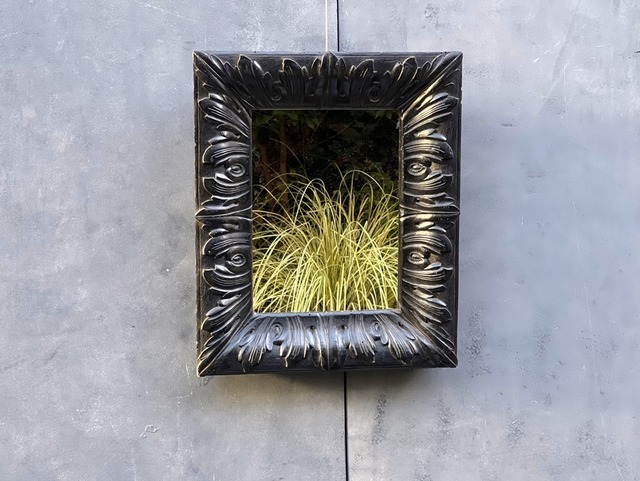 ブラックにペイントされたフランスの古い木製ミラーです。アカンサスの葉が彫刻が黒くペイントされ存在感があります。モダンなインテリアに合わせても素敵な空間が演出出来ます。アンティーク特有の細かい傷がございますが、ミラーは新しいものに交換済みです。 全高:430mm 全幅:355mm 厚さ:45mm 画像と実際の商品の色味が少々異なる場合がございます。アンティーク商品は、製造時や長い年月を経てついた傷や汚れなどがございます。それらをアンティークの味としてご理解の上、ご注文をお願いいたします。