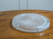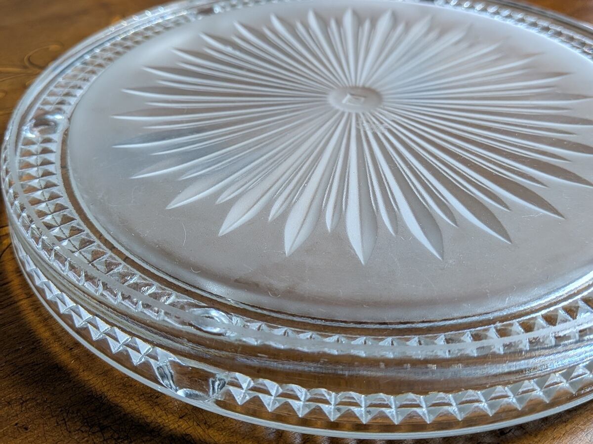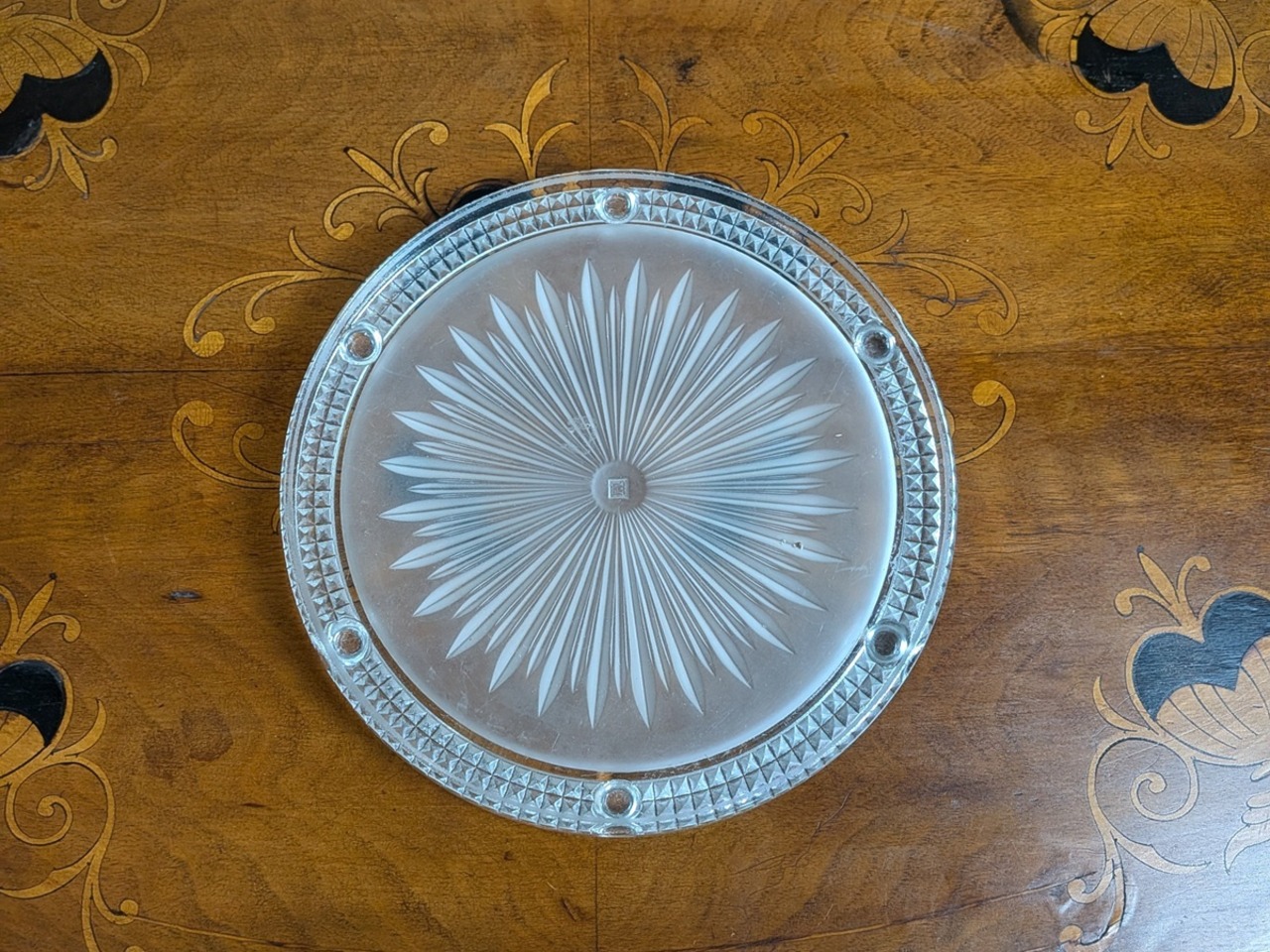 こちらは高台になっているプレートです。食材を置くだけで高級感が出せます。ケーキやチーズをのせて、ガラスドームをのせても絵になります。裏側に2mmほどのカケがございますが、使用には殆ど問題無いと思います(画像でご確認ください)。他にもアンティーク特有の気泡や細かい傷がございます。(最後のお写真のケーキドームは別売りです)