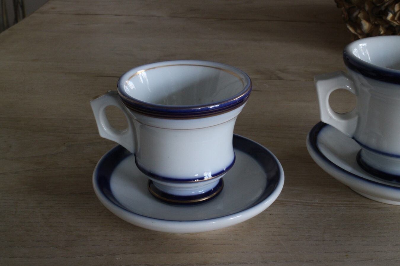 フランスの1880年頃のブリュロと呼ばれるカップ。濃い目のコーヒーを飲んだ後に裏側の凹みにアルコールを注いで飲んでいたそうです。ぽってりとしたカップに深い藍色のライン、ソーサーの縁にもラインが入っています。ソーサーにカップを置くくぼみが無いので、お菓子をのせて おもてなしなんていかがでしょうか?価格は1客のお値段です。在庫が2個で1個購入の場合、右側か左側をご指定下さい。