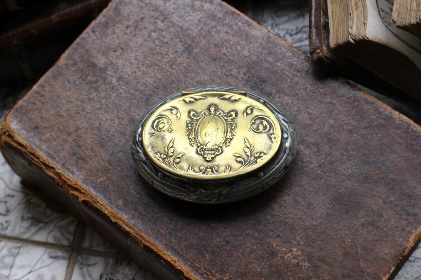 こちらは ゴールドとシルバーカラーの小さなケースです。 内側に鏡が付いています。アンティーク特有の細かい傷などございますが、アンティークならではのとても良い雰囲気です。
