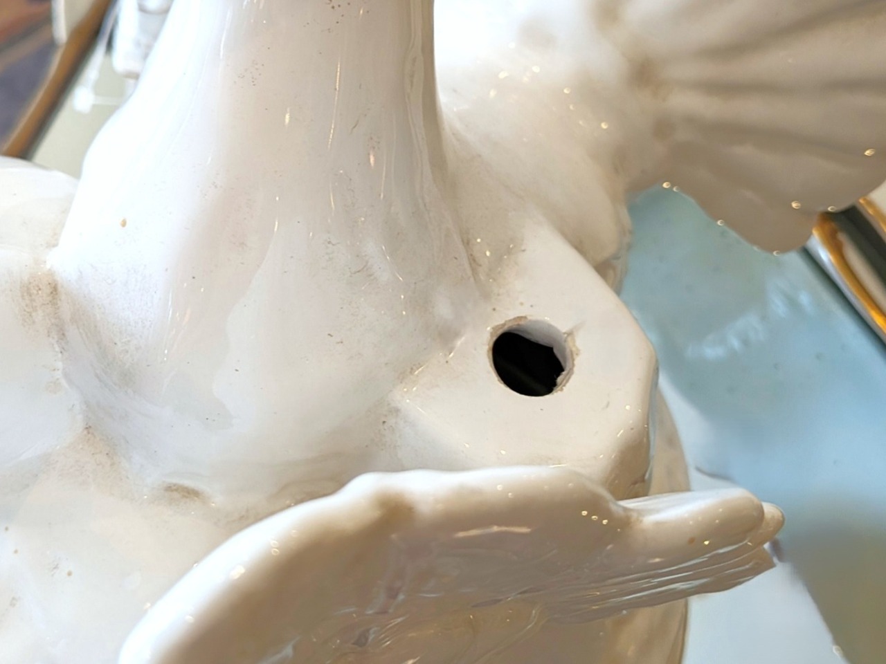 フランスでみつけた愛と平和の象徴である白い鳩の大きな置物です。優雅なフォルムと美しい色合いが、優雅な雰囲気をもたらします。何かを挿して使われていたのか裏側に穴が開いています。アンティーク特有の細かい傷はございますが、ヒビや欠けはございません。