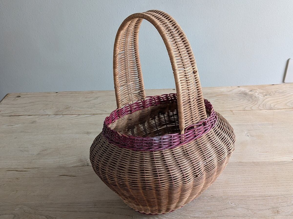 こちらはフランスでみつけたウィッカーバスケットです。しっかりとした作りの取っ手で、籠の縁と底に赤い色が入った可愛らしい形です。本や小物、レースや雑貨を見せながらの収納として使ったり、ドライフラワーを飾るだけでも絵になります。傷みも少なくしっかりしています。手作りの温かみが感じられるバスケットは、いろいろ重宝して置くだけで空間が変わります。