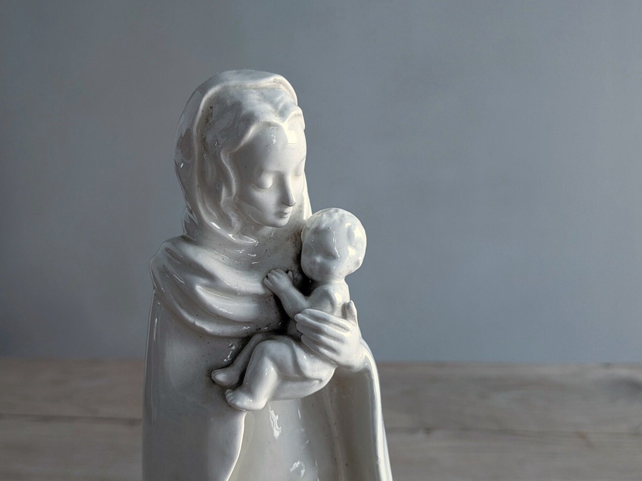 西ドイツのGoebel(ゲーベル)社と合併し世界的な陶磁器人形メーカーとなったHummel社、その第一人者の職人であったGerhard Skrobek(ゲルハルト・スクロベック) が有名です。当時の職人の手によって一つ一つ手作りされ2008年に製造が終わりました。手作りの温かみが感じられる現代でもコレクターが多いフンメル人形です。こちらは温かみのある色合いの白に高級感ある光沢が施されたイエス・キリストと聖母マリアの像です。アンティーク特有の細かい傷、底の部分にカケがみられますが、この時代のものとしては比較的綺麗な状態です。