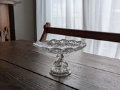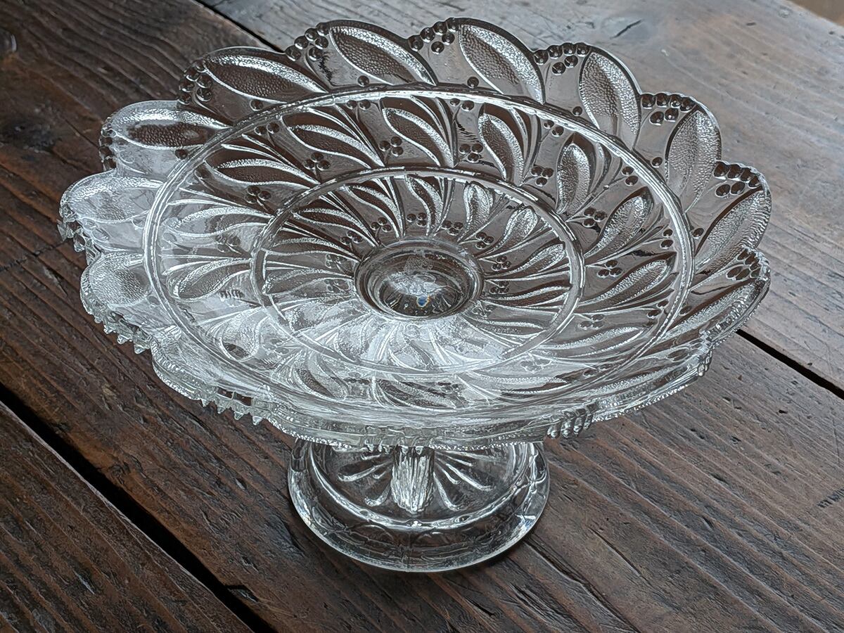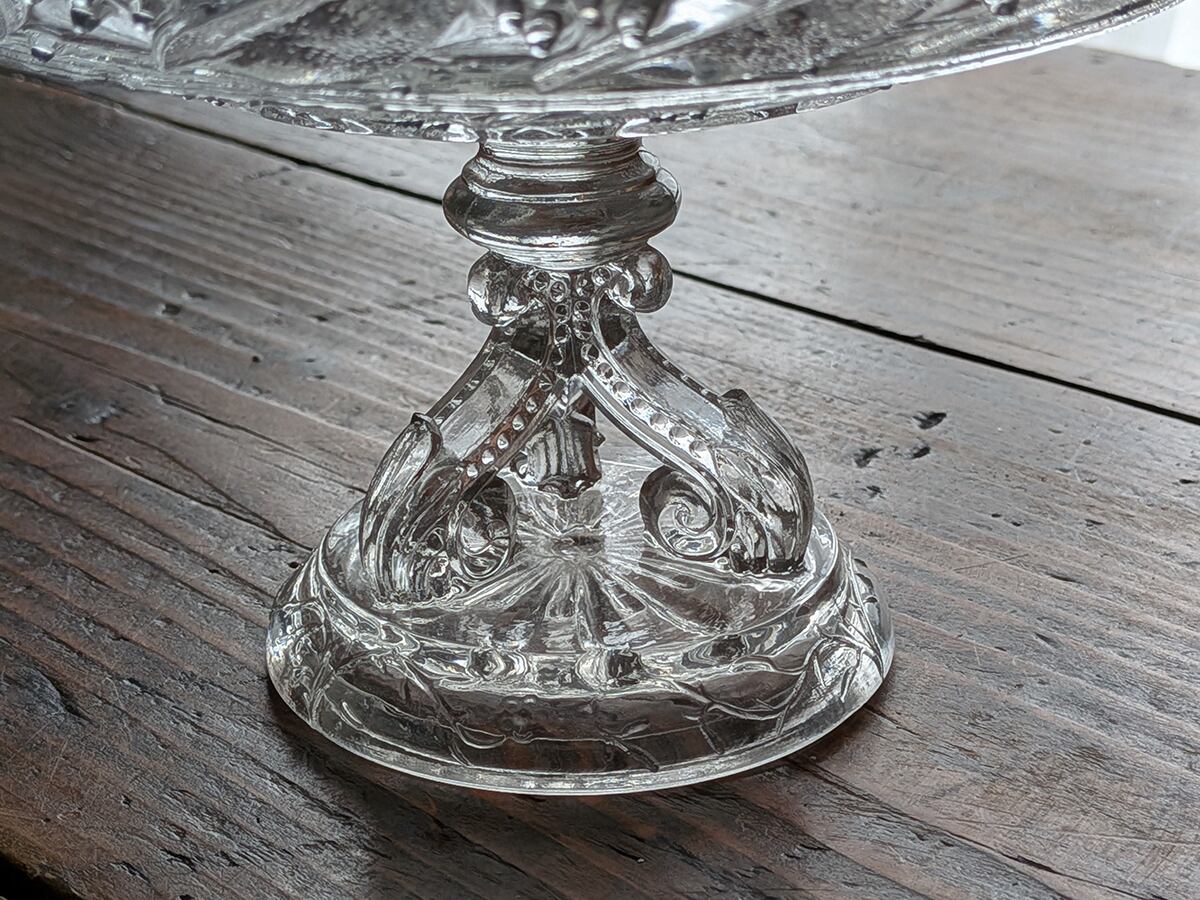 フランスのプレスガラスのケーキスタンドです。高台のケーキスタンドはテーブルがとても華やかになります。ケーキだけではなく焼き菓子を並べたり、小さな小物をのせたり、ドームをのせてテーブルディスプレイとして使ったり、ショップディスプレイとしても、とても使えるアイテムです。アンティーク特有の細かい傷、製造時にできたヒビに見える線や気泡はございますが、ヒビや欠けはございません。