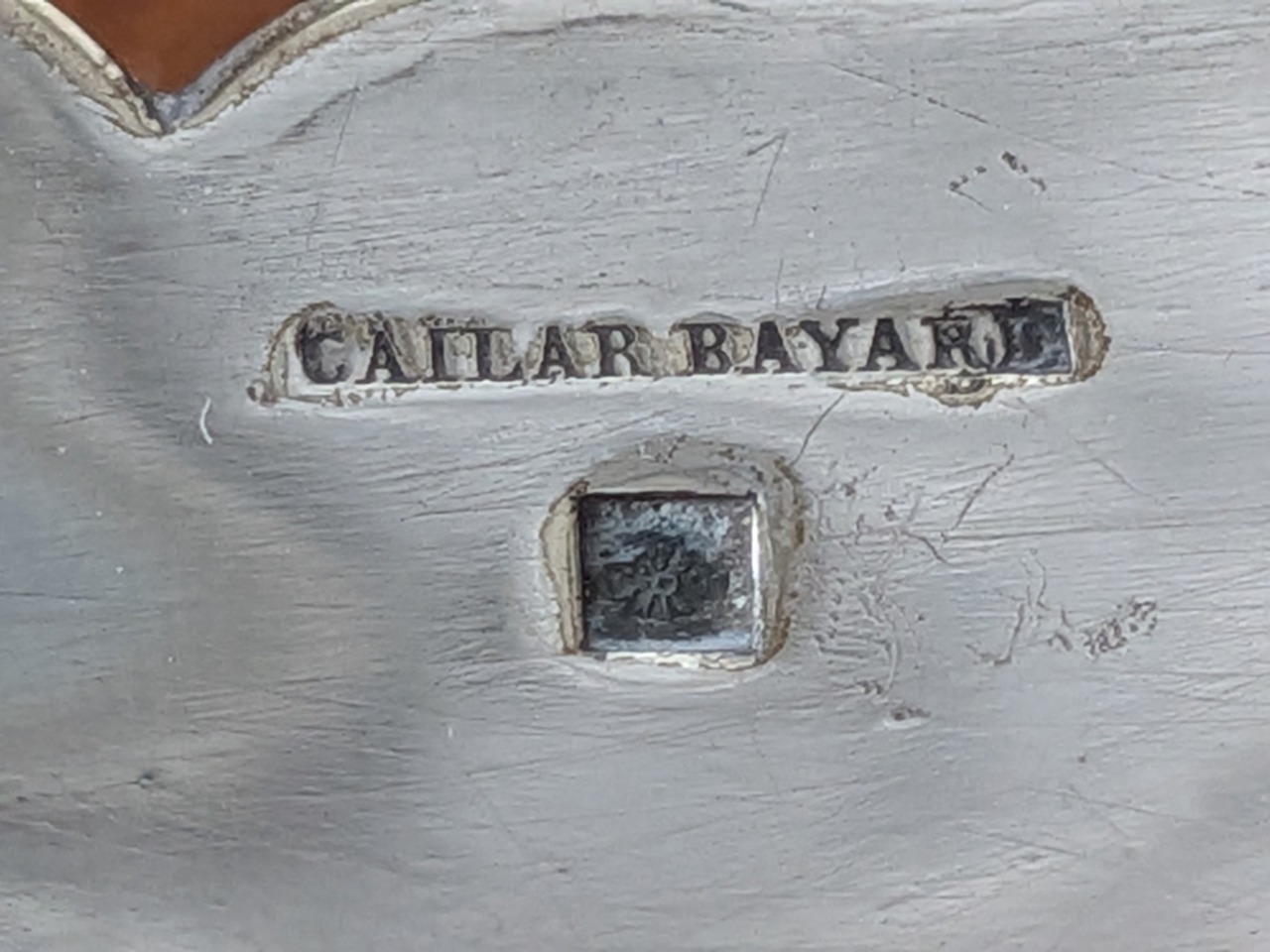 フランス1848年創業のCailar Bayard社のシルバープレーテッドのダストパンです。Cailar Bayard社はパリ万博での受賞、1912年クリストフルに買収され1936年に営業を終えるまで、多くのカトラリーを生産する知られたメーカーとなりました。こちらは中央にイニシャルが施されたロココのエレガントで高級感のあるデザインのダストパンです。パンが主食のフランスではテーブルの上のパンくずを集めるのにブラシとトレイがセットになったものが使われていました。現代の生活でもテーブルやデスク回りで便利にお使い頂けそうです。