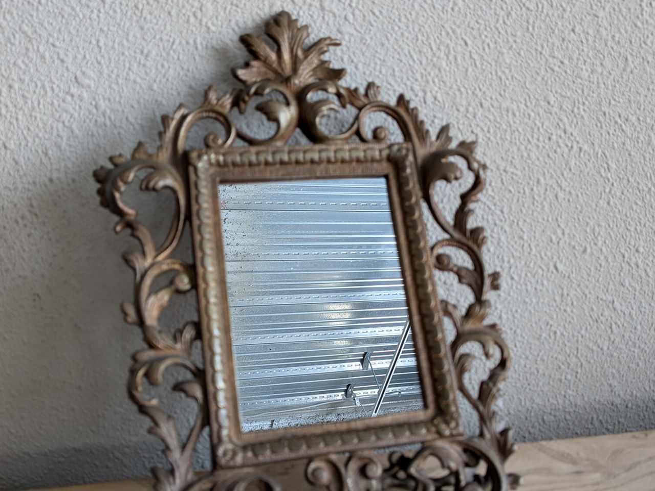 フランスのロココなデザインのブロンズミラーです。アカンサスの葉の流れるような力強い曲線のデザインは存在感があり、風格が感じられます。時を経たブロンズの風合いも魅力的です。新しい鏡に交換済みです。
