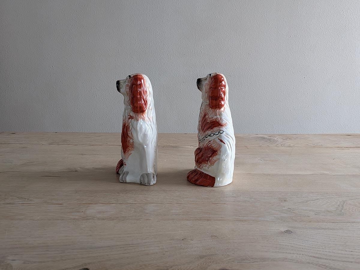 19世紀イギリスの陶器の産地スタッフォードシャーで作られていた陶製の犬です。地名からスタッフォードシャードッグ、用途からマントルドッグとも呼ばれています。スタッフォードシャーでは1720年頃から陶製のスパニエルが作られていましたが、イギリス王室がキング・チャールズ・スパニエルを好んでいたことや、1840年頃ヴィクトリア女王の愛犬スパニエルのダッシュがモデルとなった置物が人気となったことで、ヴィクトリア時代のブルジョア階級貴族達のステータスとして貴族の間で流行しました。マントルピースの上や窓辺にシンメトリーに置く為、2個ペアで作られていました。こちらは鍵のペンダントと鎖の模様が描かれた白と茶色のスパニエルです。スタッフォードシャードッグは太い眉、大きな目が特徴で、色々な犬種の色々な表情のものがあります。現在は殆ど作られていないため、アンティークのコレクターズアイテムとして人気があります。アンティーク特有の傷などございますが、大きな割れやひびはございません。