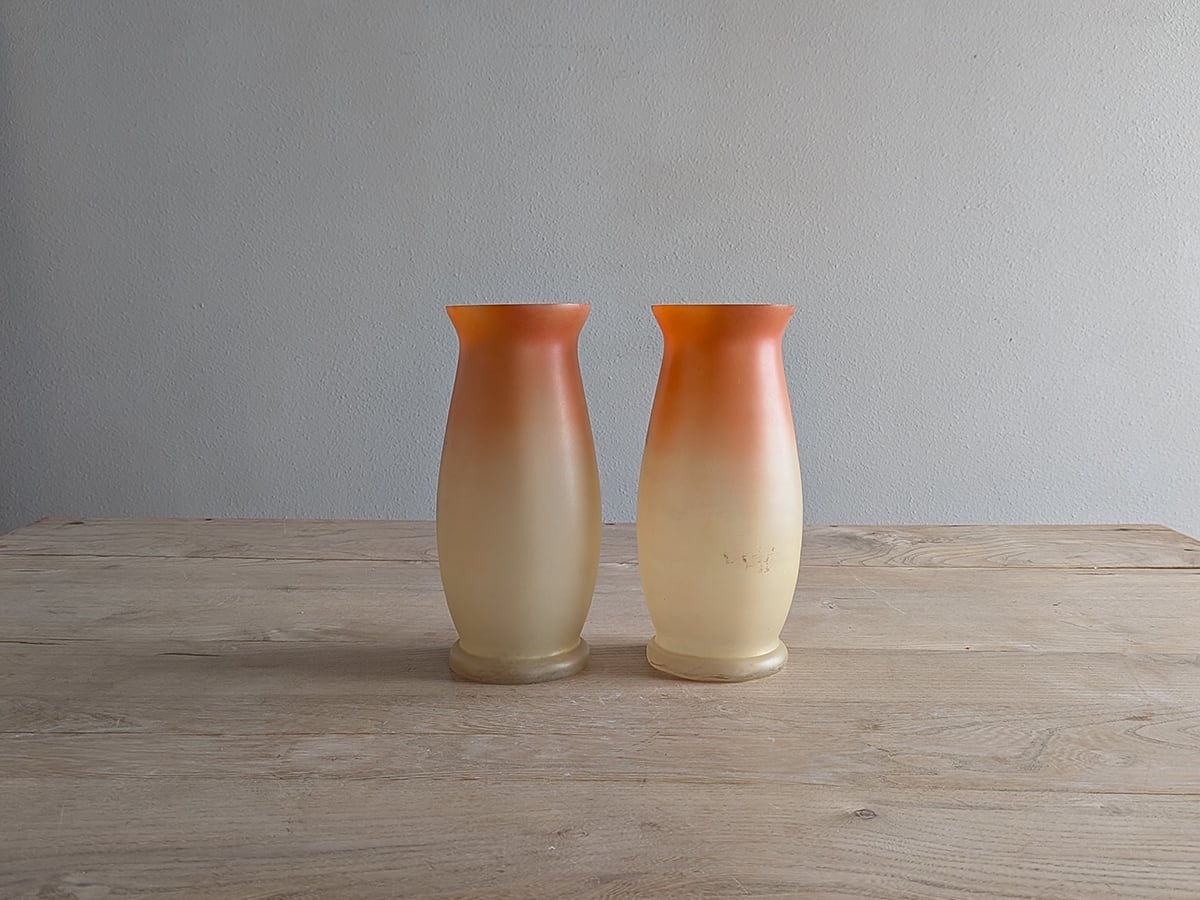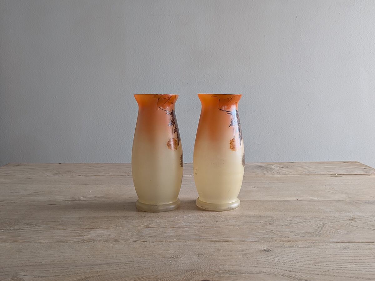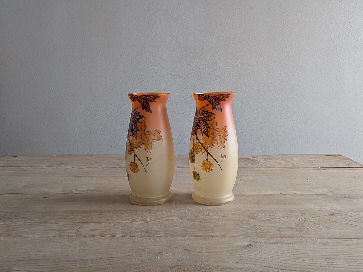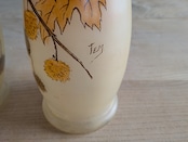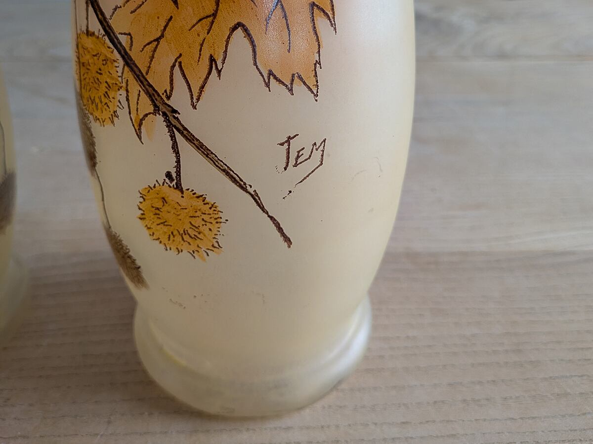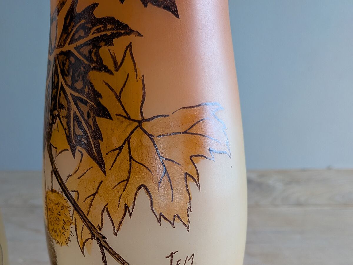 1864年に創業したルグラ社は色ガラスとエナメル彩に定評がありました。昨今その価値が見直されています。こちらはルグラの弟子だったと言われているジョセフ・ミュール(Joseph mure/1920-1944)の作品でプラタナス柄にエナメル彩が施されたフラワーベースです。オレンジとブラウンのグラデーションに光を通すと癒される色合いです。ジョセフ・ミュールの作品は1920年から1936年にかけて制作され『JEM』のサインが入っています。アンティーク特有の細かい傷はございますが、ヒビや欠けはございません。価格はひとつのお値段です。