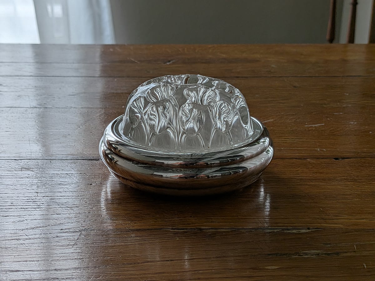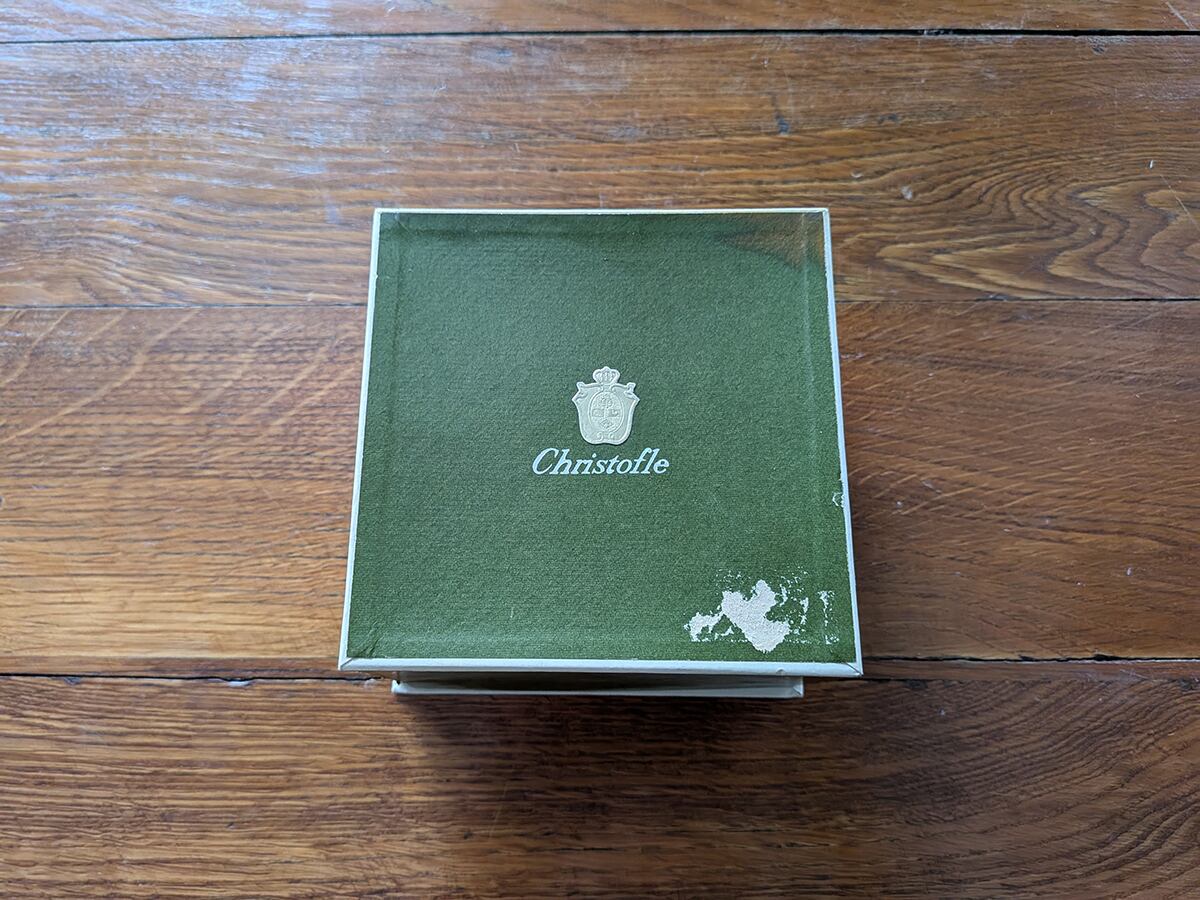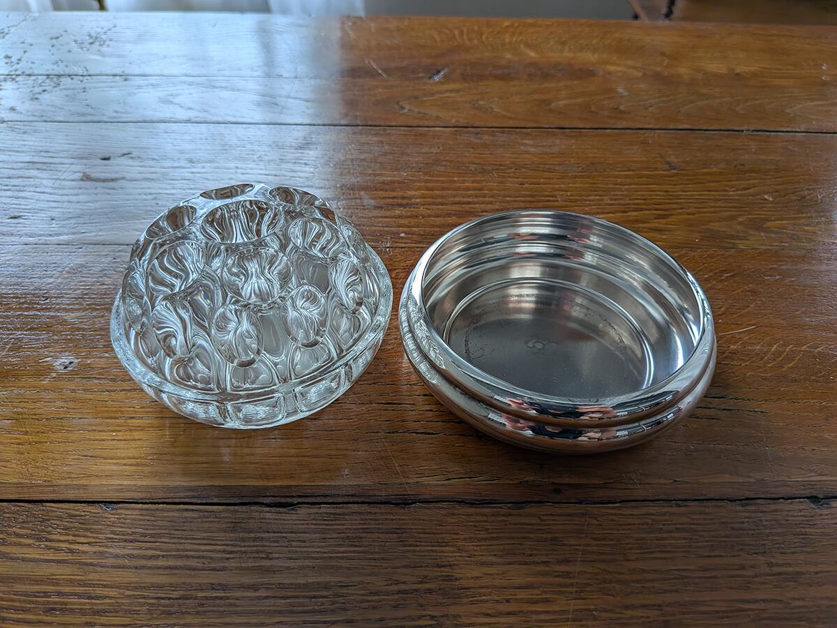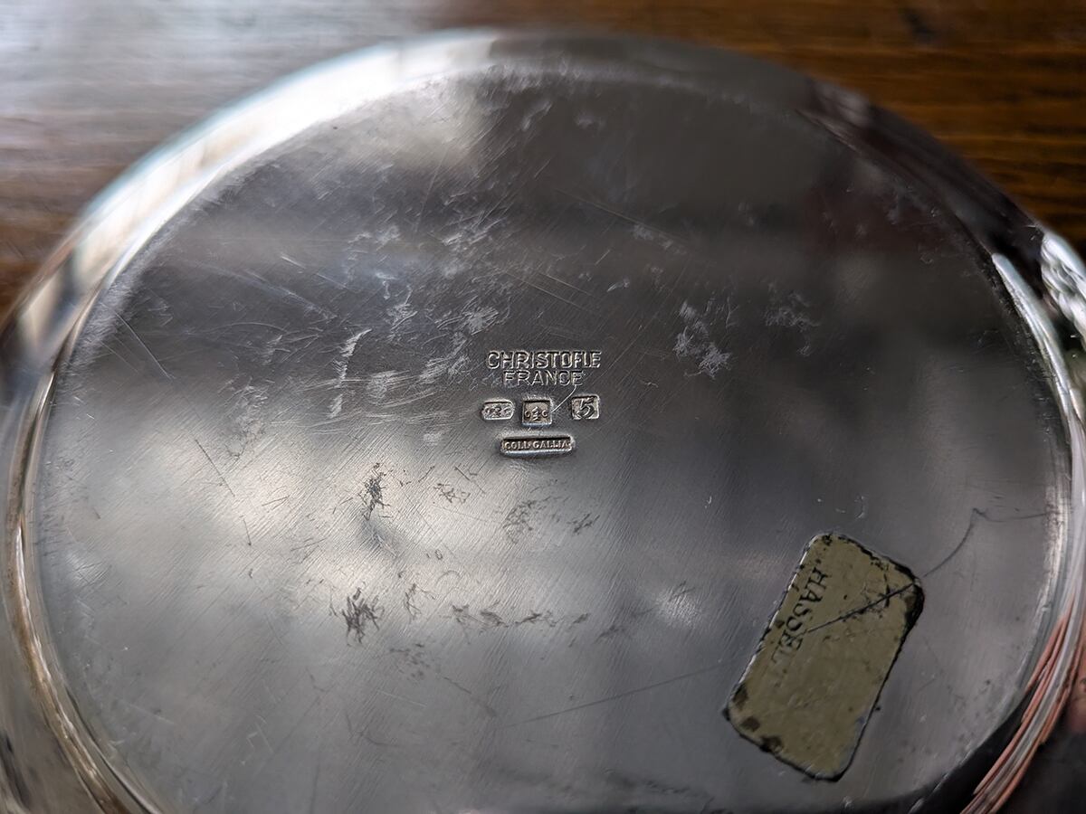 フランスで1830年創業という老舗のクリストフル社は世界に名高い銀食器の最高級ブランドとして知られています。ルイ・フィリップ王やナポレオン3世の宮廷で使用され、現在でも公邸や一流ホテルやレストラン、豪華客船などで広く愛用されています。クリストフル社の銀食器は「卓上の芸術品」と呼ばれています。こちらはフロッグベースと呼ばれる花瓶です。蛙の卵のような見た目からでしょうか、多数の穴のところに植物を挿すタイプの花器をそう呼びます。穴が開いたガラスが嵌められたフラワーベースです。裏側に1935年から1975年に使用されていた「COLL. GALLIA」とシルバープレートを意味する刻印がございます。蜂の巣のようなガラスの穴に水を入れて、切り花やグリーンを差し込めば簡単にアレンジが作れます。そのまま置いてあるだけでも存在感があります。アンティーク特有の細かい傷はございますが、ヒビや欠けはございません。