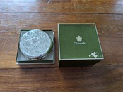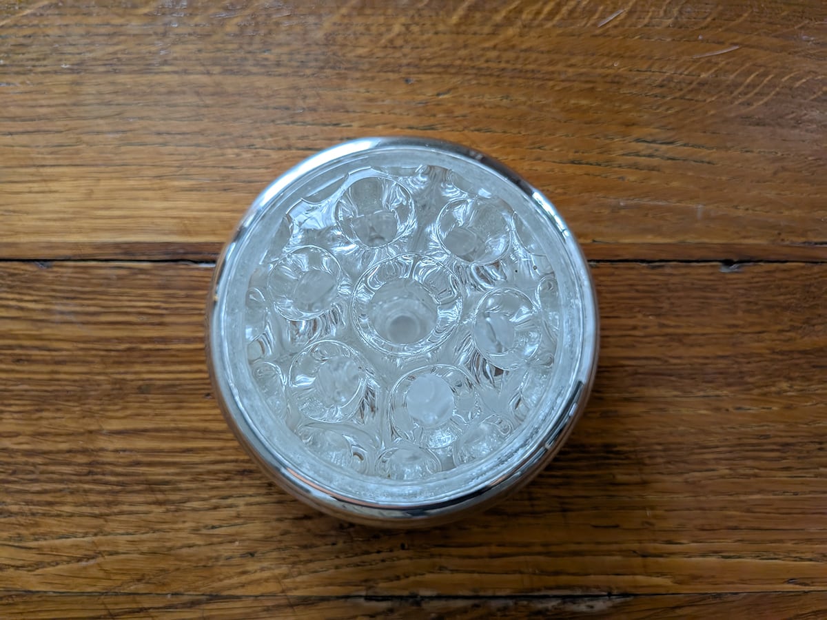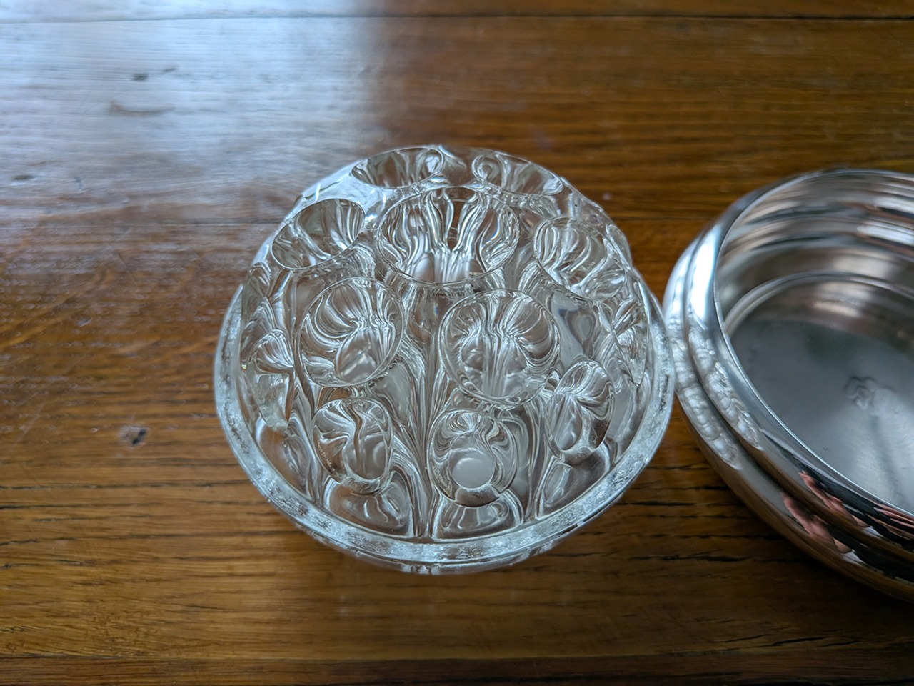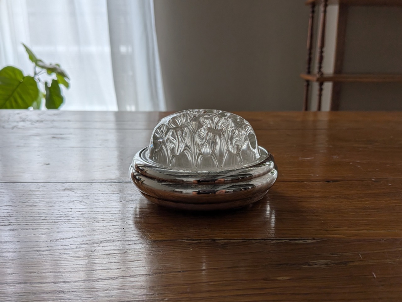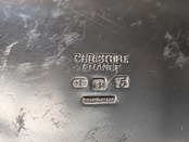 フランスで1830年創業という老舗のクリストフル社は世界に名高い銀食器の最高級ブランドとして知られています。ルイ・フィリップ王やナポレオン3世の宮廷で使用され、現在でも公邸や一流ホテルやレストラン、豪華客船などで広く愛用されています。クリストフル社の銀食器は「卓上の芸術品」と呼ばれています。こちらはフロッグベースと呼ばれる花瓶です。蛙の卵のような見た目からでしょうか、多数の穴のところに植物を挿すタイプの花器をそう呼びます。穴が開いたガラスが嵌められたフラワーベースです。裏側に1935年から1975年に使用されていた「COLL. GALLIA」とシルバープレートを意味する刻印がございます。蜂の巣のようなガラスの穴に水を入れて、切り花やグリーンを差し込めば簡単にアレンジが作れます。そのまま置いてあるだけでも存在感があります。アンティーク特有の細かい傷はございますが、ヒビや欠けはございません。