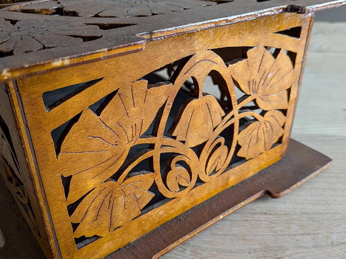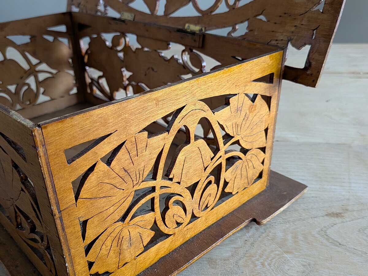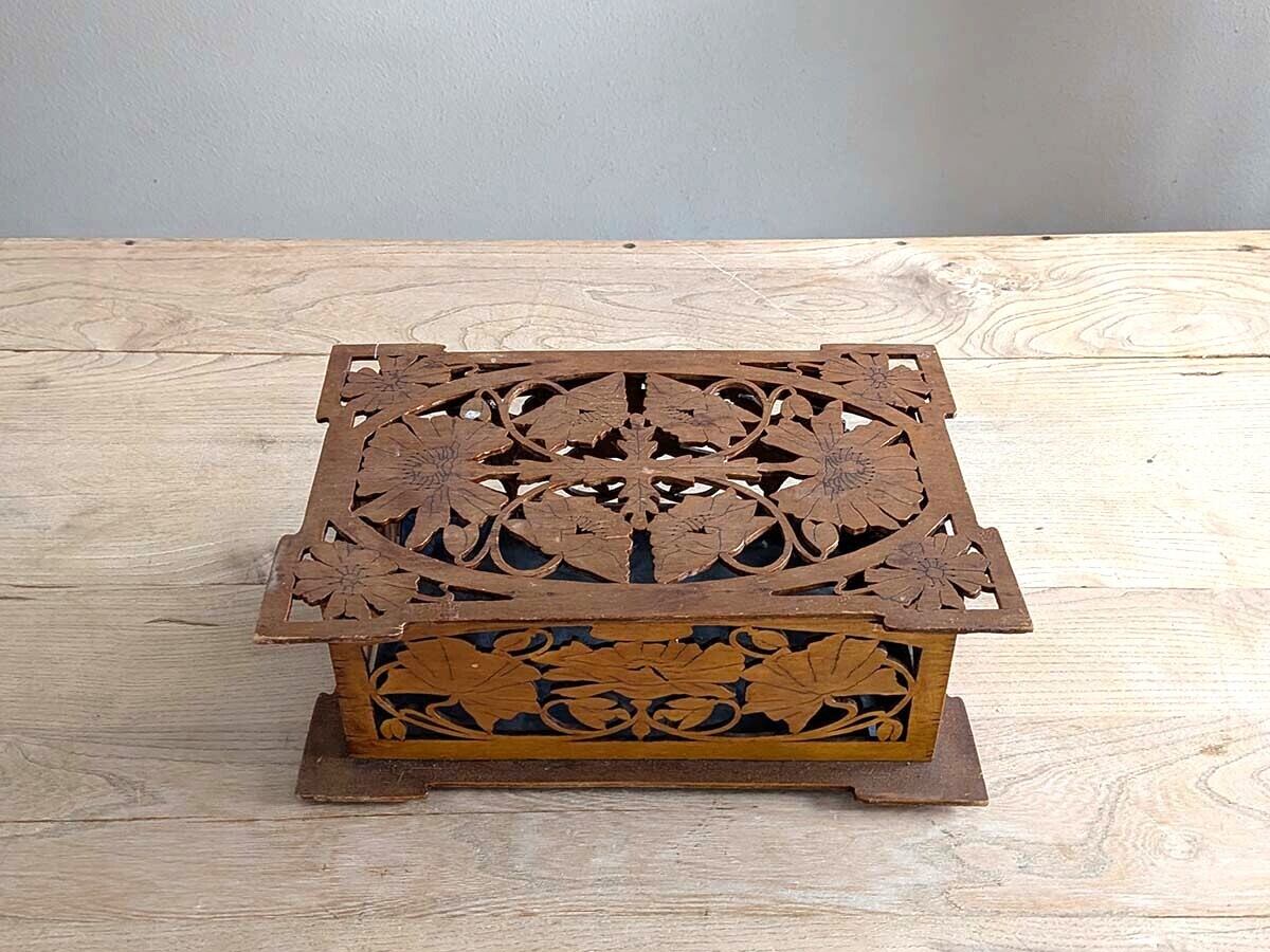フランスでみつけたアールヌーボーが感じられる透かし彫りのボックスです。ポピーの花と蕾のような柄が施された上品なデザインで、手作業によって丁寧に作られています。時を経た味わいが感じられるアンティークならではの雰囲気が魅力的です。全体にアンティーク特有の細かい傷や汚れなどがございますが、比較的綺麗な状態です。