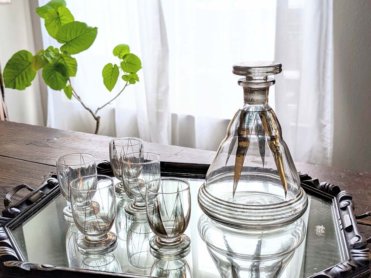 こちらはベルギーのミッドセンチュリーのカラフェとリキュールグラスのセットです。三角形の金彩が施されていて高級感があります。スタイリッシュでモダンなインテリアにも合わせやすいデザインです。金彩の剝れやアンティーク特有の細かい傷はございますが、ヒビや割れはございません。