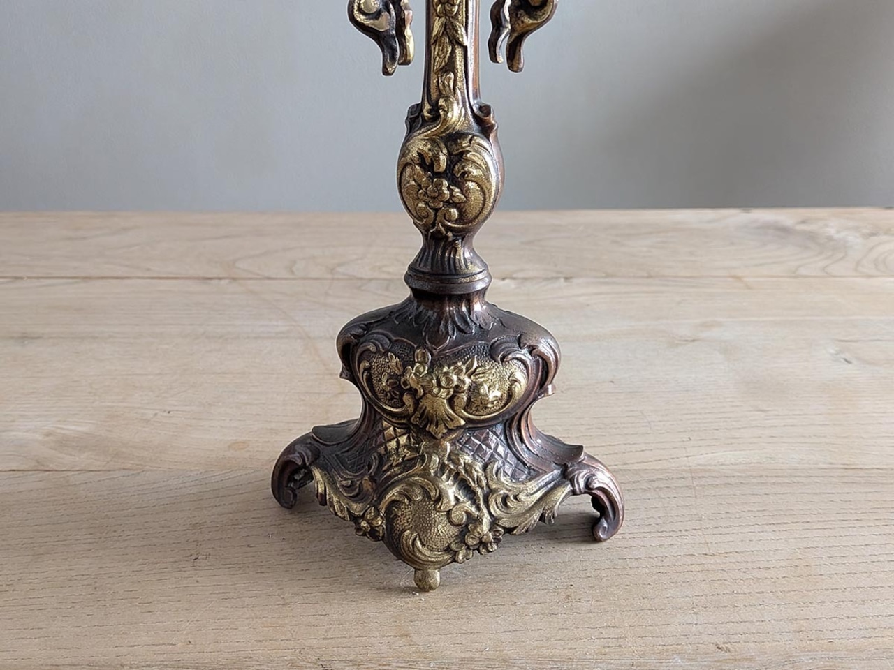 フランスバロック様式の大きなブロンズキャンドルスタンドです。豪華絢爛な空間に合わせて作られた躍動感のある力強い装飾が施され、置いてあるだけでも存在感があります。年月を経て変色した色合いや緑青が、とても良い雰囲気です。