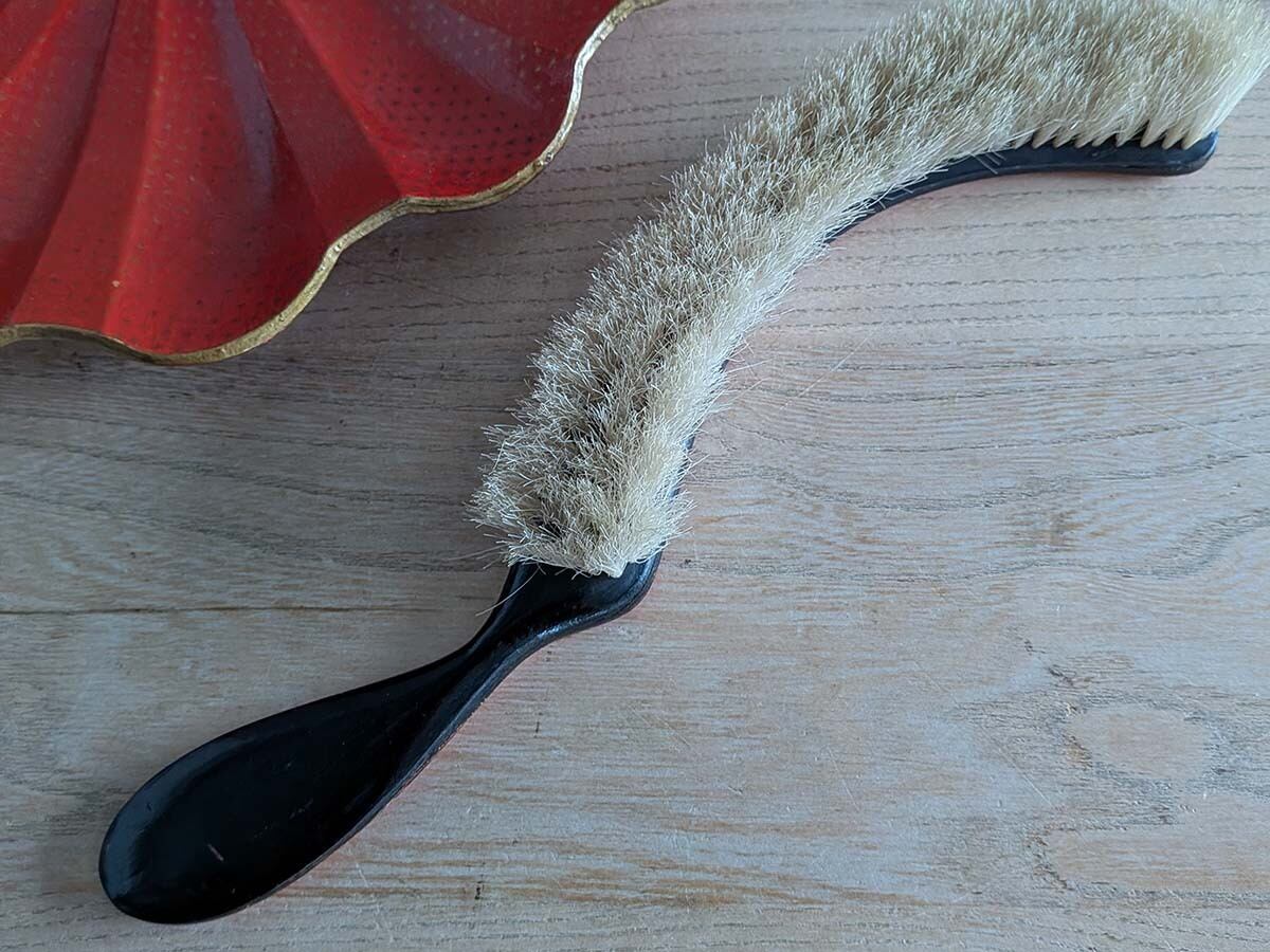 こちらはナポレオン三世様式のパピエマシェのブラシとトレイです。パンが主食のフランスではテーブルの上のパンくずを集めるのにブラシとトレイがセットになったものが使われていました。パピエマシェは東洋の漆をイメージして、紙を圧縮したものに膠を塗り作られたものです。シルバープレートのものが主流になる前の18世紀から19世紀初頭まで作られていました。黒と赤い塗りにプリントやハンドペイントされたものが当時の流行りのようです。こちらはその中でも人気のあるゴールドの星柄がプリントされたブラシとトレイのセットです。アンティーク特有の細かい傷はございますが、十分お使いいただけます。