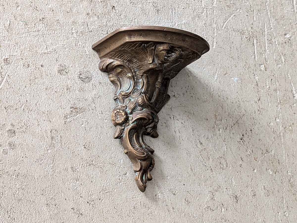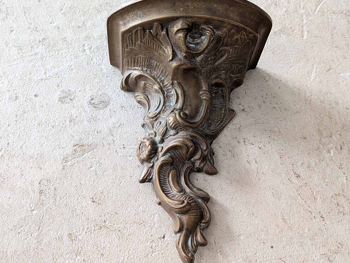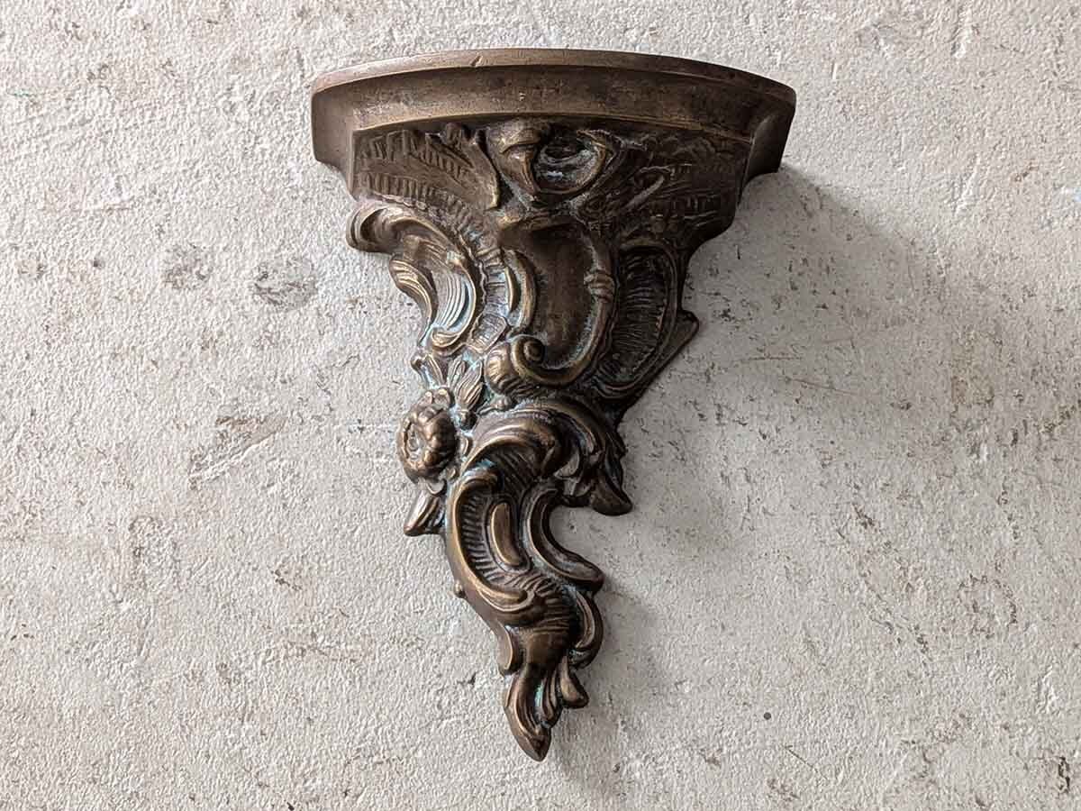 フランスでみつけたブロンズのロココなウォールブラケットです。ロカイユがモチーフの華やかなデザインで、時を経た落ち着いた色が魅力的で壁に飾るだけで雰囲気が変わります。小さな棚としてお気に入りの小物を飾っても良いですね。