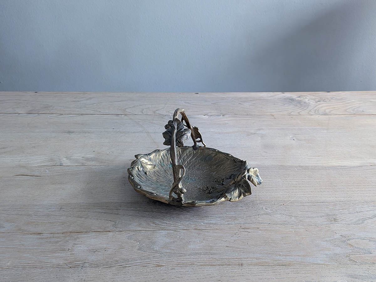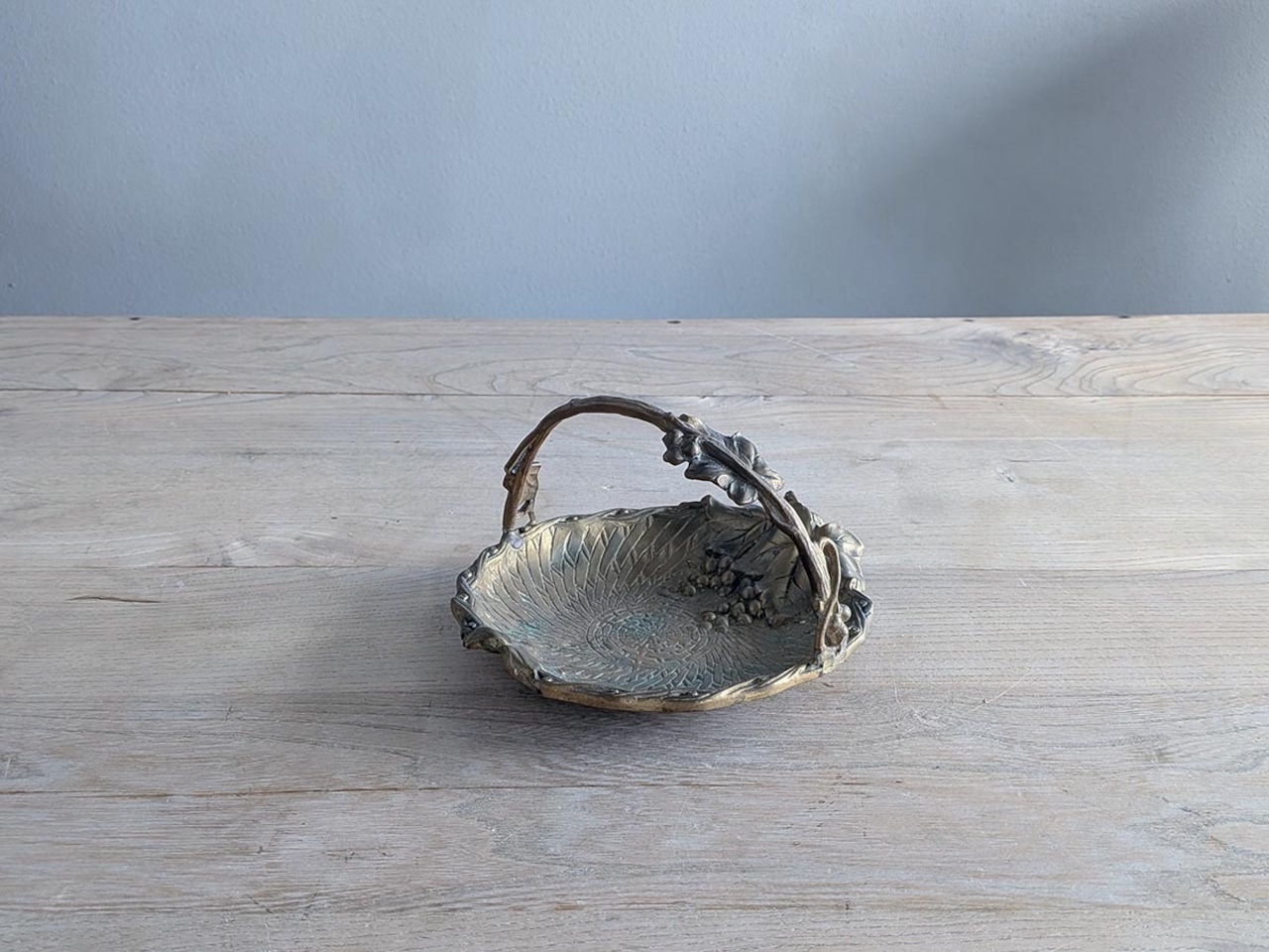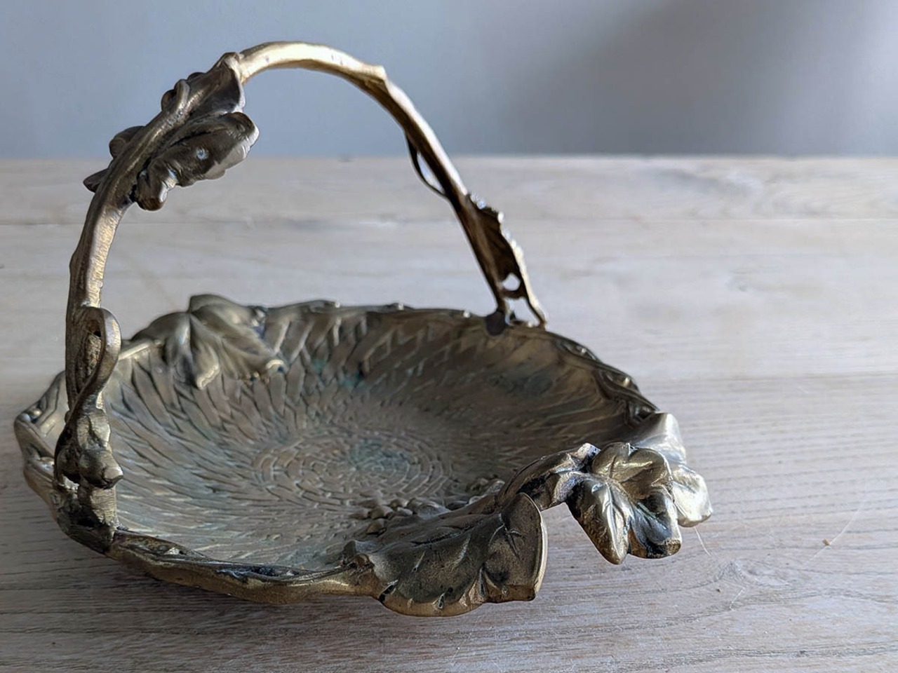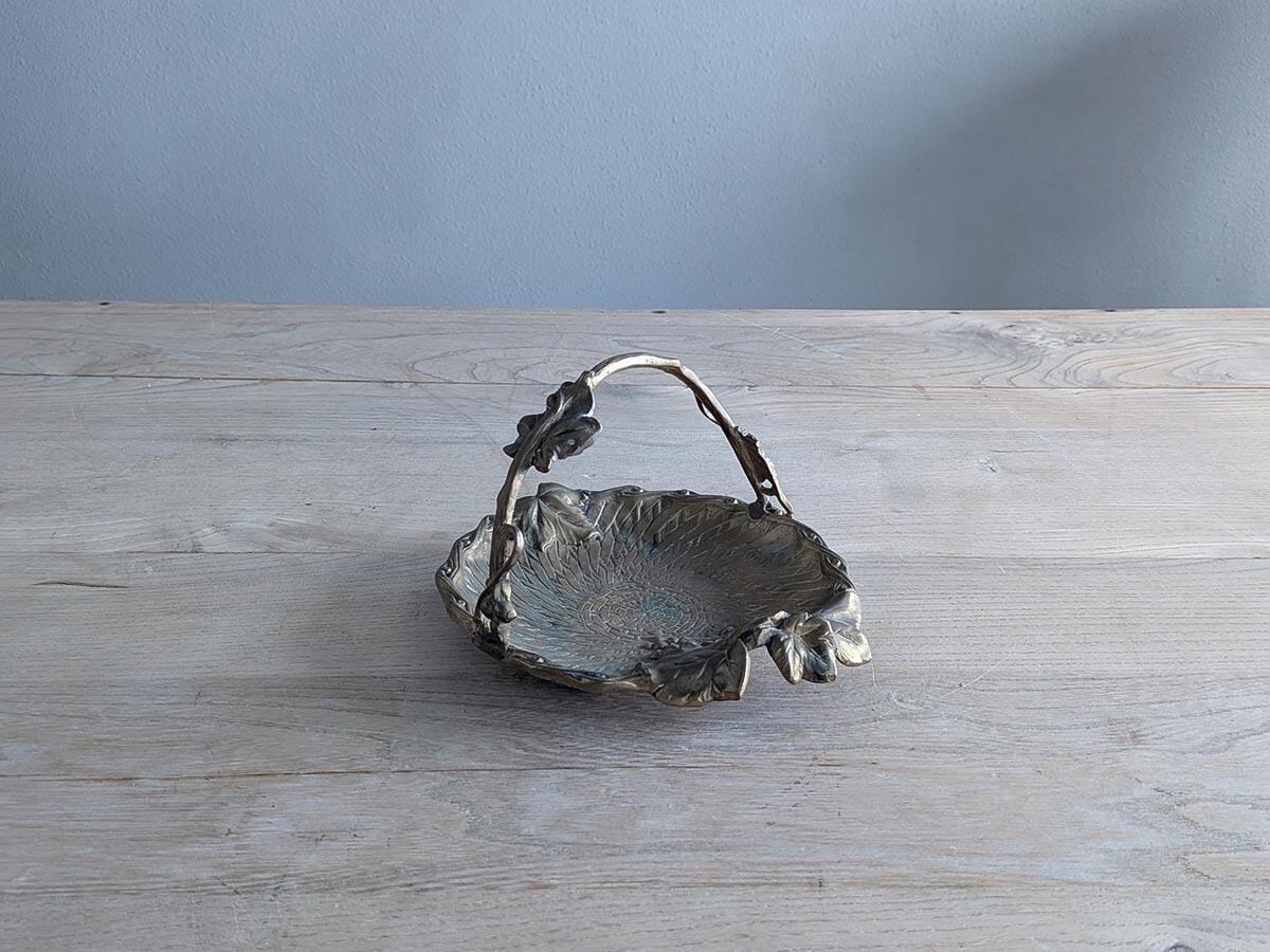 ハンドル付きのバスケットに葡萄の柄が施されたフランスのブロンズトレイです。波打つような葉やふっくらとした実、バスケットの網目も細かく表現されています。作家名は入っていませんが、ずっしりとして迫力ある作品です。アンティーク特有の細かい傷はございますが、ヒビや欠けはございません。