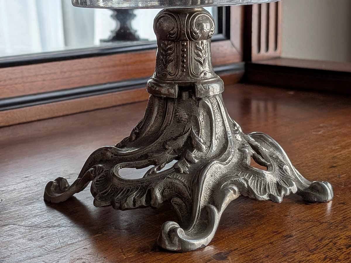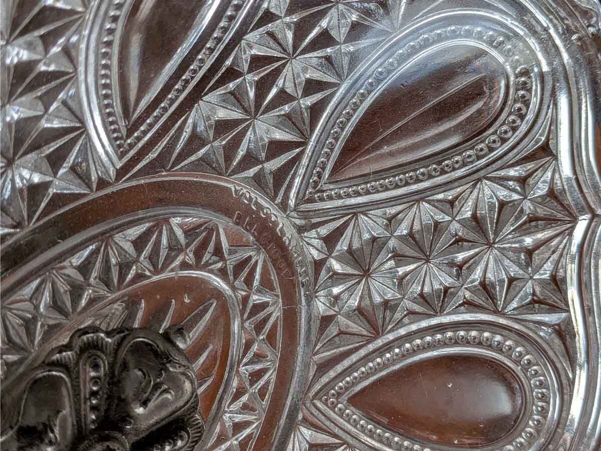 ベルギーのクリスタルメーカーヴァルサンランベールのコンポートです。厚みがあって重厚感があり、光を通すとクリスタルのカットがキラキラ輝きます。高さがありますので、フルーツをのせたりするだけでなく、お花を飾ったり、テーブルコーディネート用としていかがでしょうか?お皿の部分にメーカーマークがございます。アンティーク特有の細かい傷はございますが、ヒビはございません。