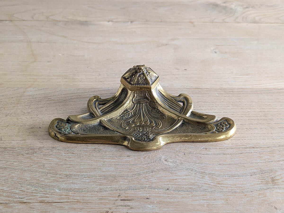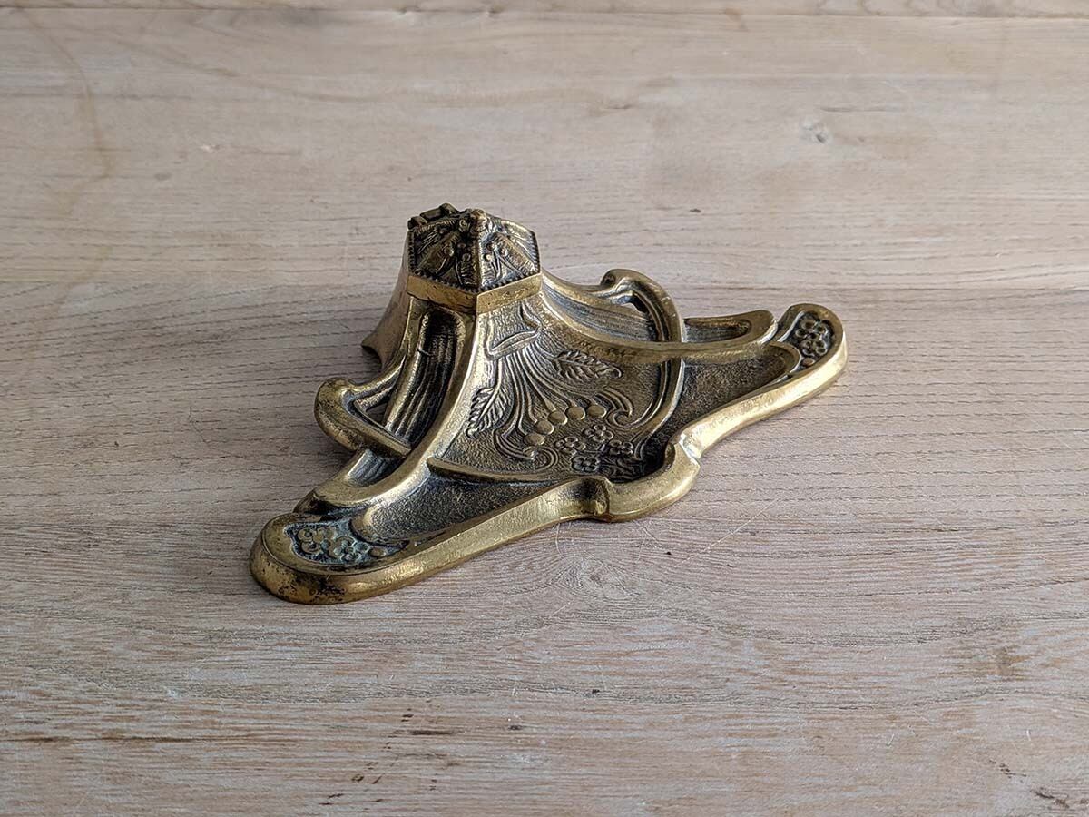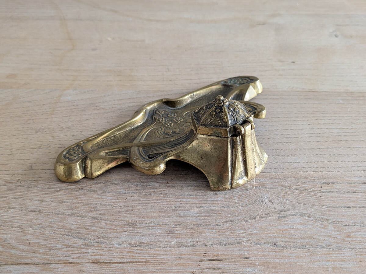 アンティークなデスクの上に置かれていたであろうアールヌーボーの美しいデザインのインクスタンドです。当時インクポットのインクを付けながら手紙や書類を書いていました。華やかな模様のペントレイがついた美しいインクスタンドです。時を経た真鍮の色が良い雰囲気です。