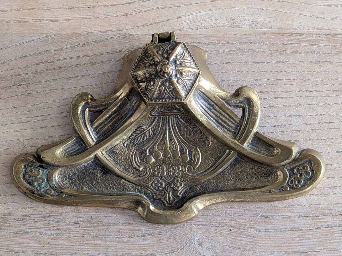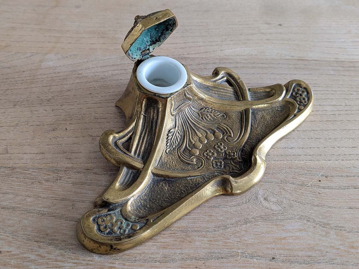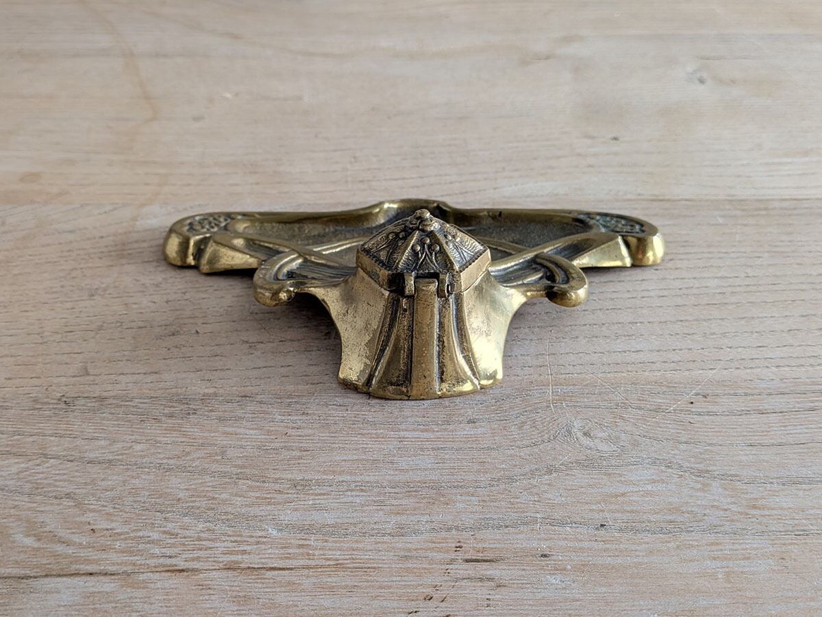 アンティークなデスクの上に置かれていたであろうアールヌーボーの美しいデザインのインクスタンドです。当時インクポットのインクを付けながら手紙や書類を書いていました。華やかな模様のペントレイがついた美しいインクスタンドです。時を経た真鍮の色が良い雰囲気です。