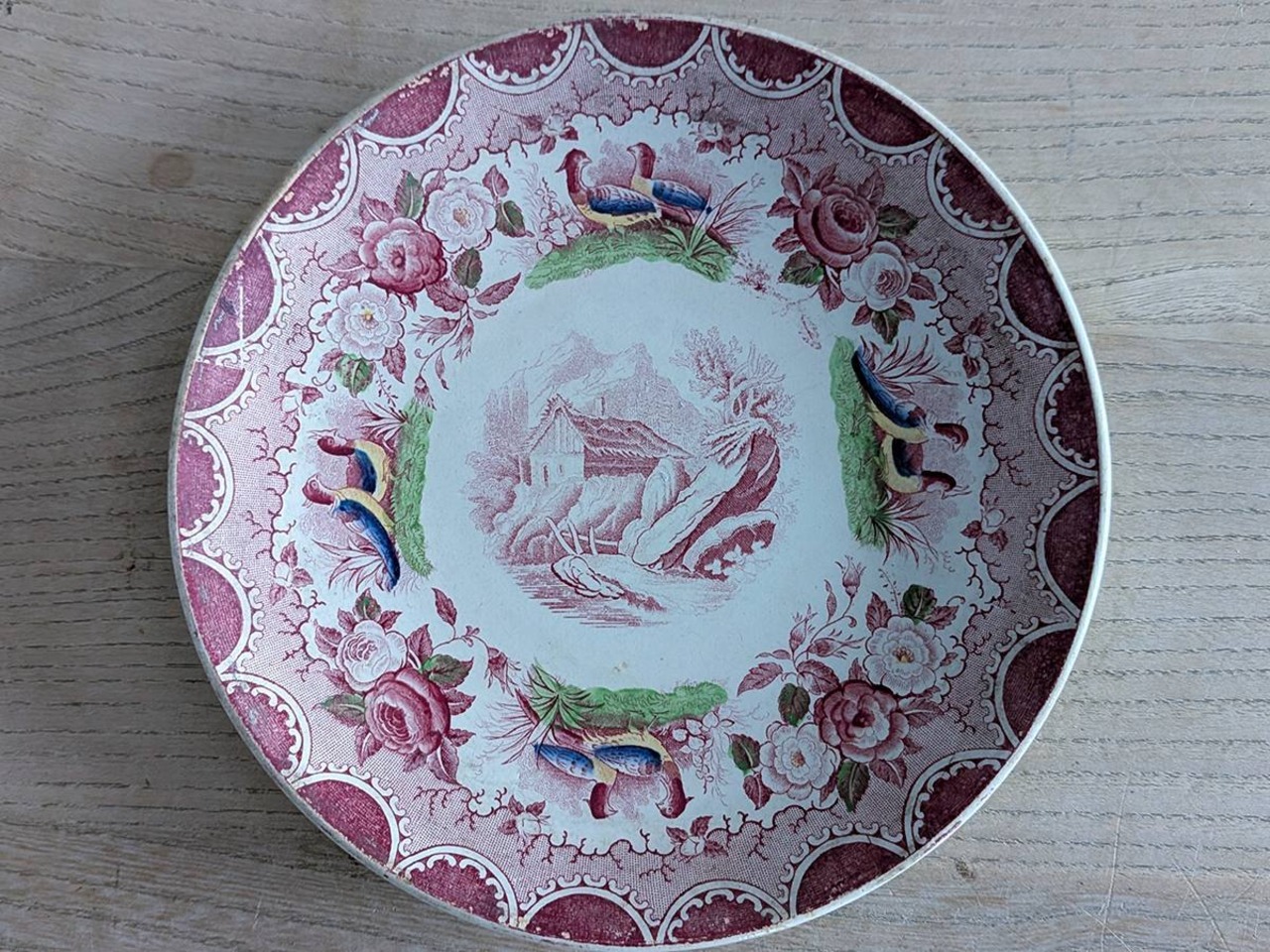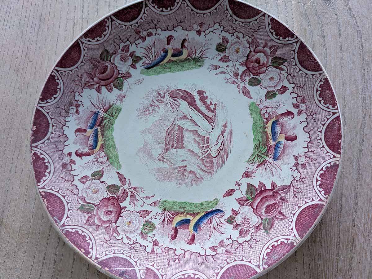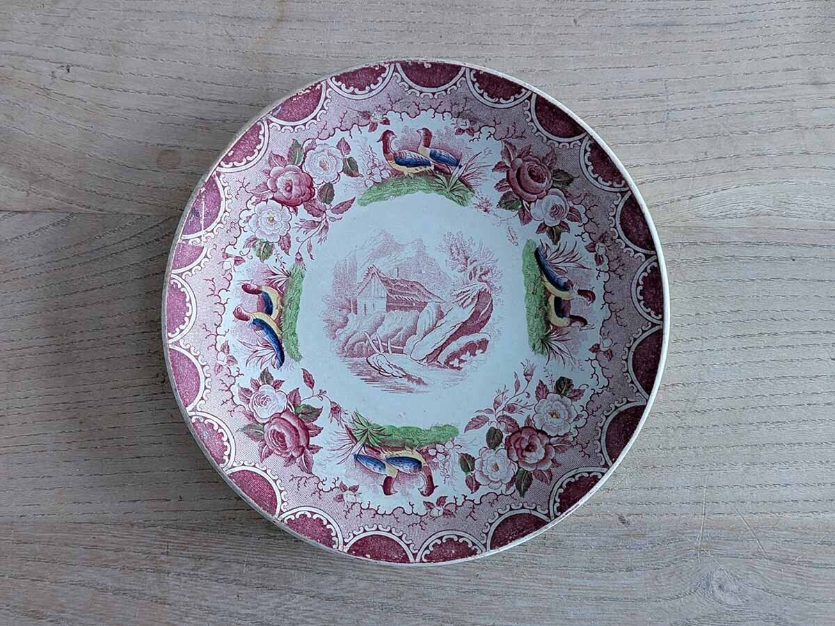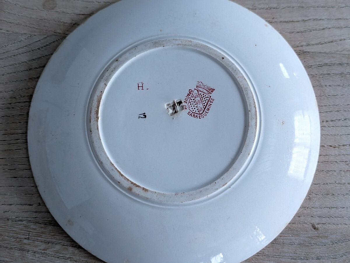 フランス、1784年創業のSarreguemines(サルグミンヌ)の人気「雉」シリーズの小さなプレートです。ぽってりとした柔らかい風合い、雉と薔薇の模様が施されたケーキプレートです。使い込まれた陶器は、そのままでも絵になります。裏に1875~1900年代に使われていたスタンプがございます。アンティークの陶器特有の貫入もございます。