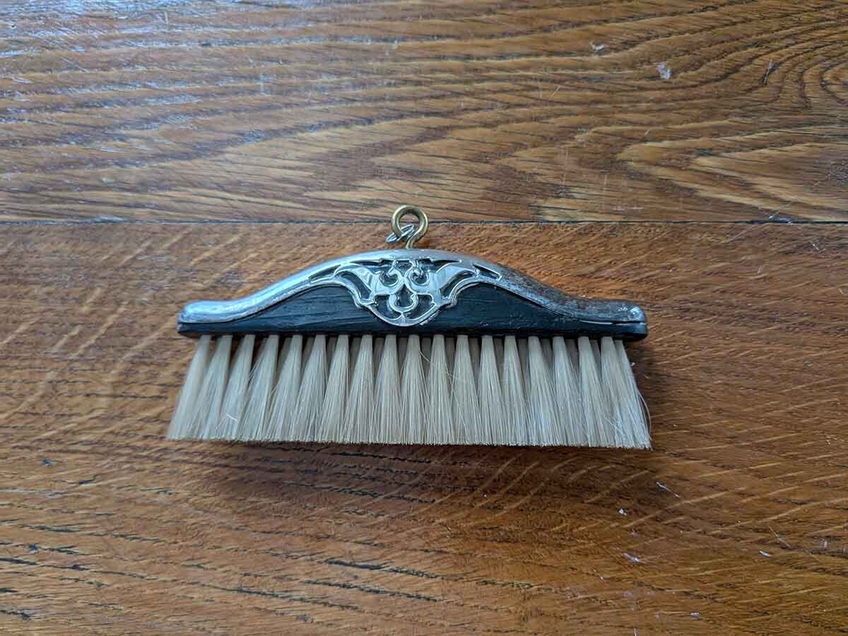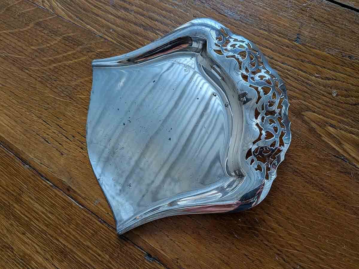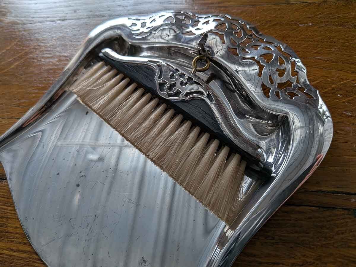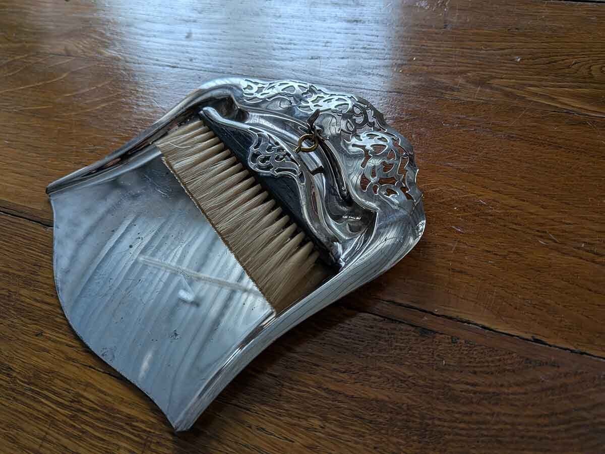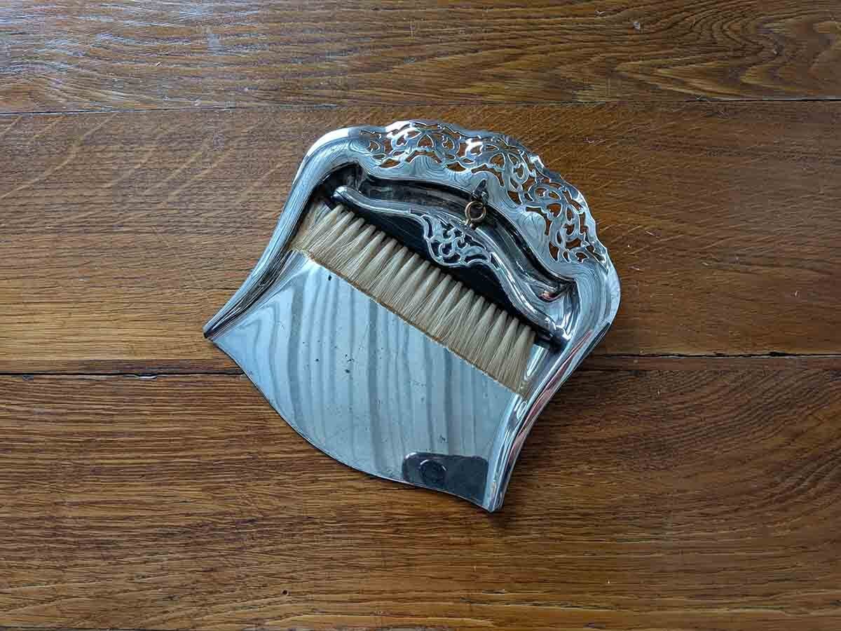 フランスのシルバープレーテッドのダストパンです。こちらは透かし加工が施されたエレガントで高級感のあるデザインのダストパンです。パンが主食のフランスではテーブルの上のパンくずを集めるのにブラシとトレイがセットになったものが使われていました。現代の生活でもテーブルやデスク回りで便利にお使い頂けそうです。