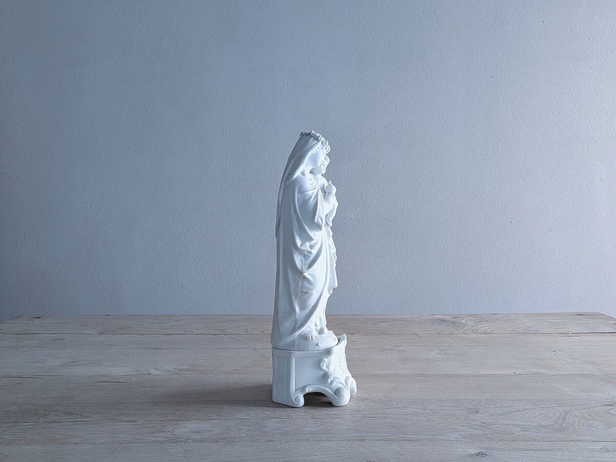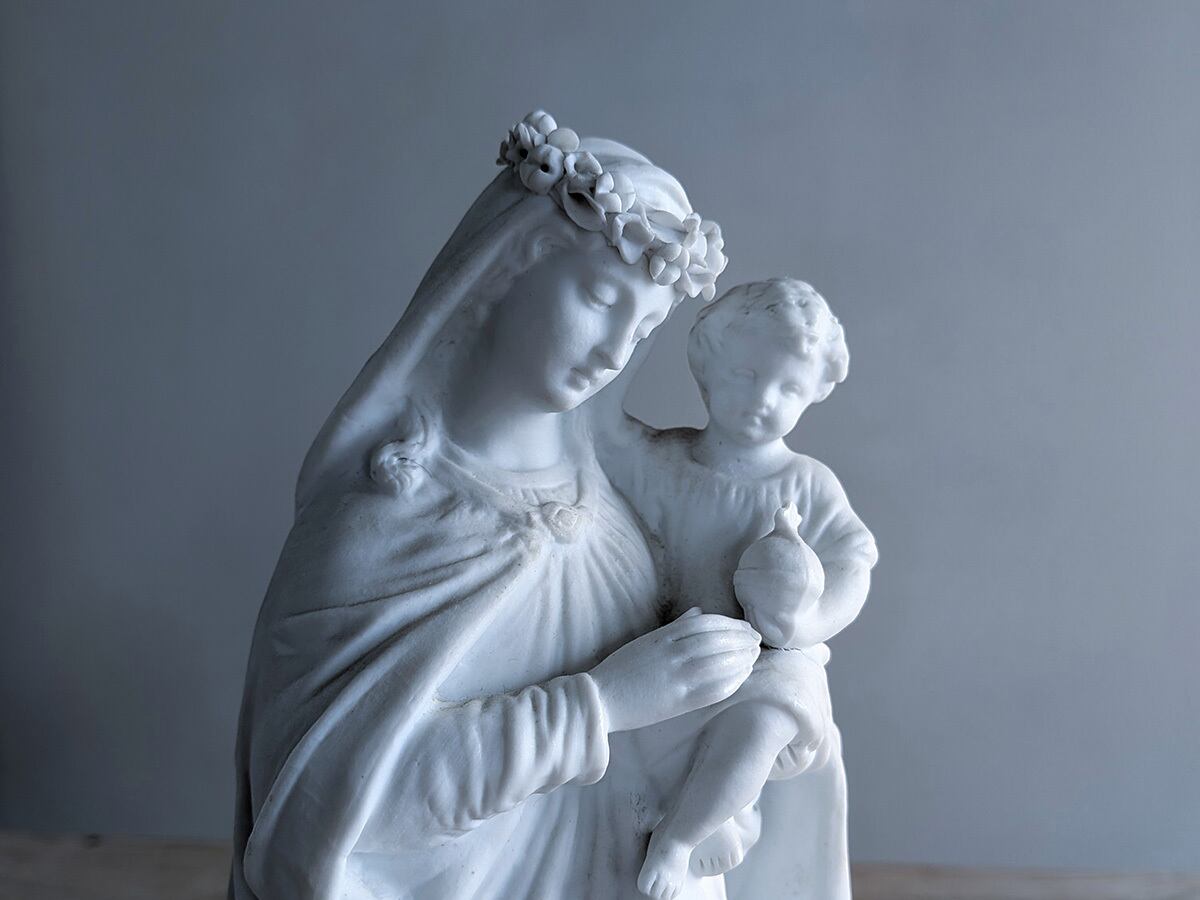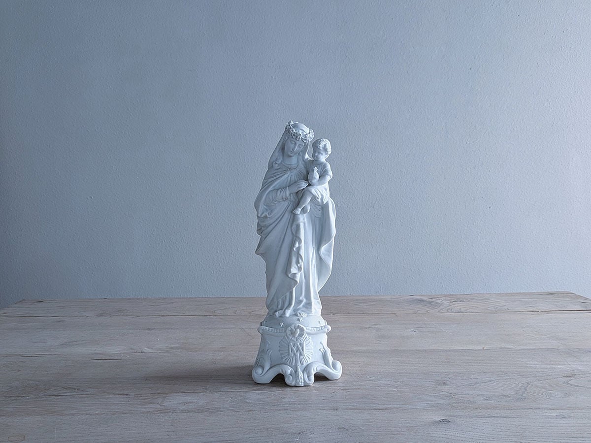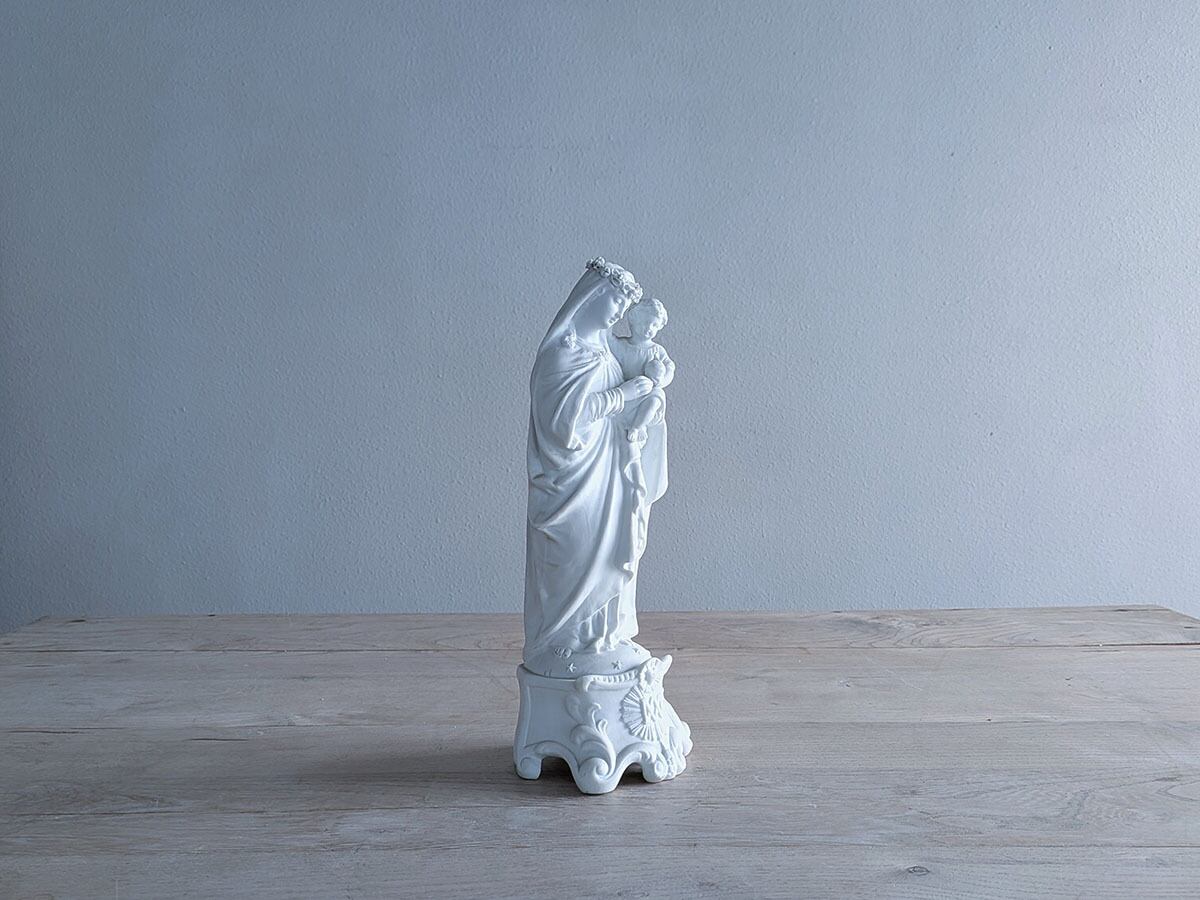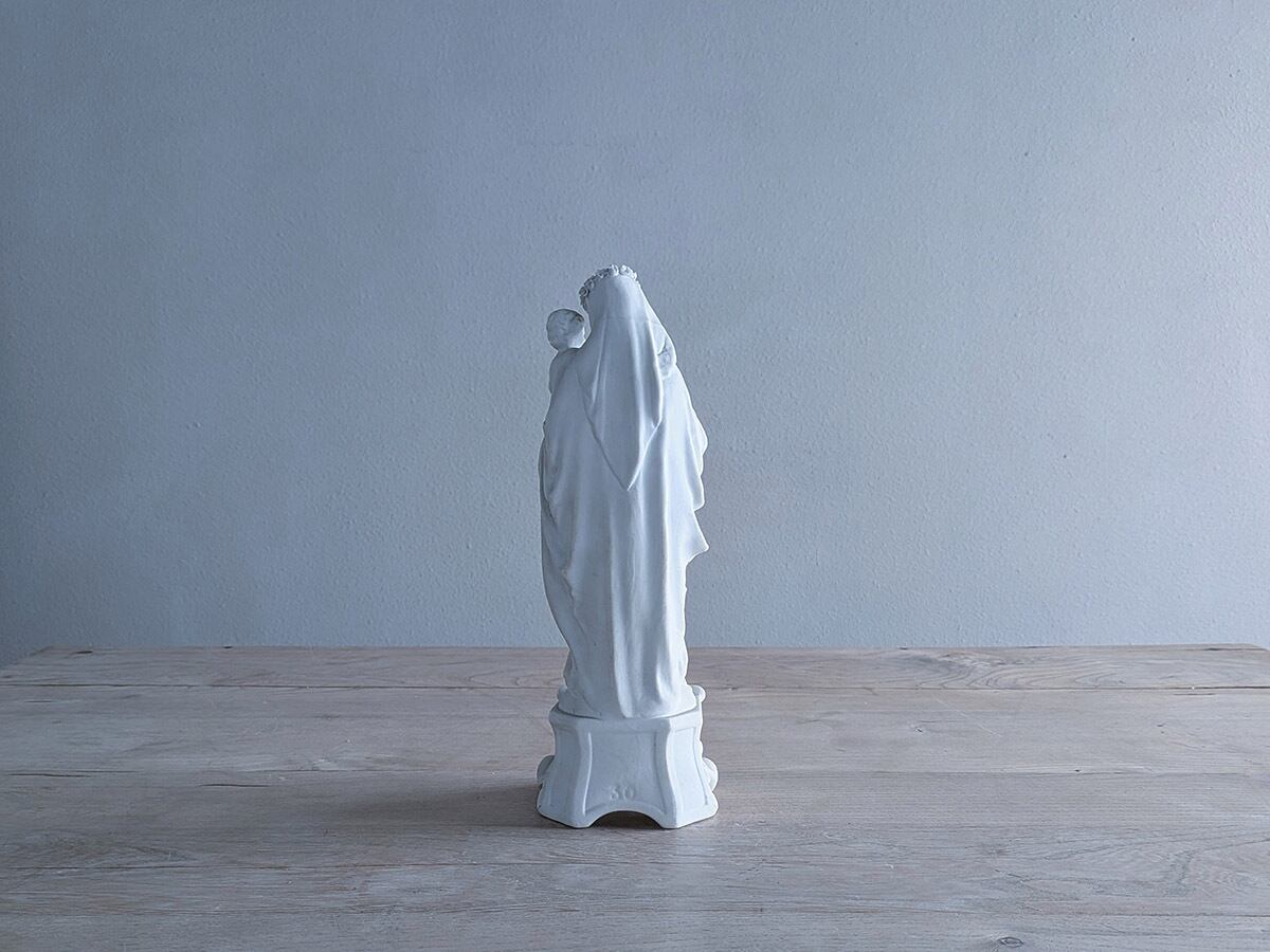 フランス19世紀ごろのビスクの聖母マリア像です。ビスクは高温で二度焼きした磁器で陶器と違って透明感があり繊細な表現が可能です。繊細な優しい顔立ちの美しいマリアす。状態は比較的綺麗です。