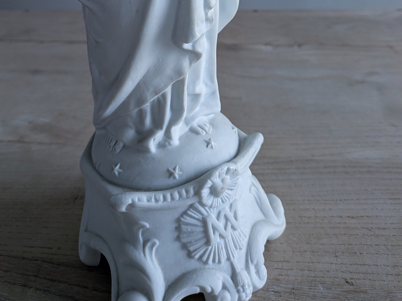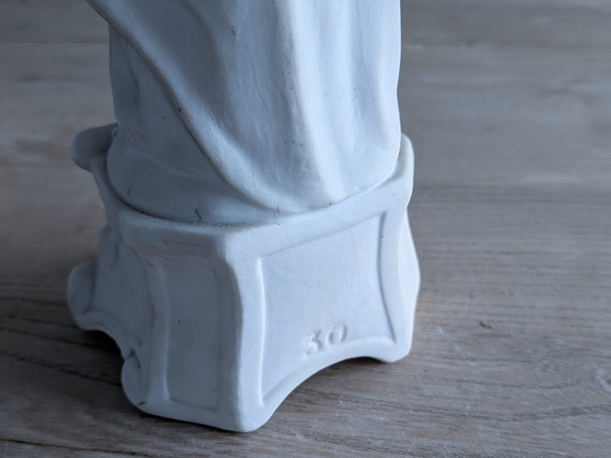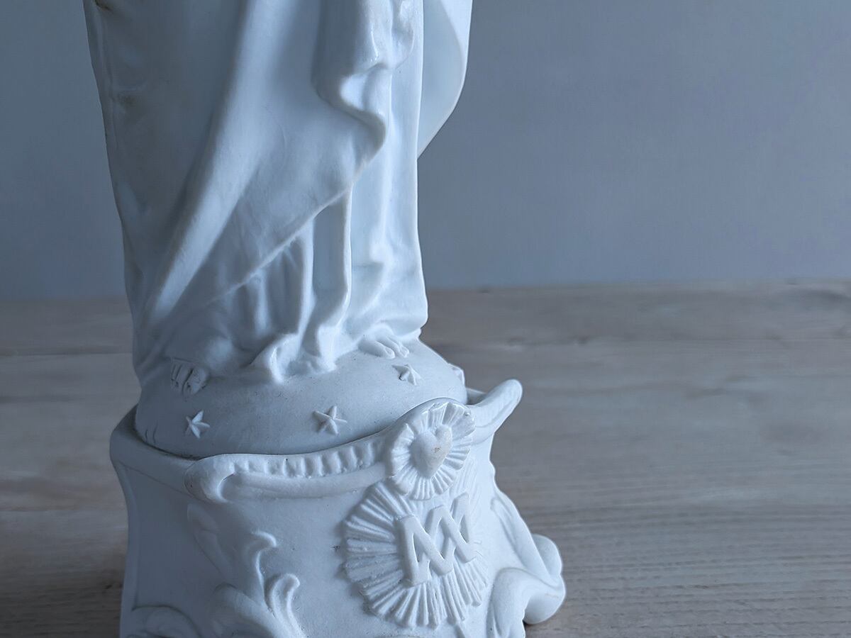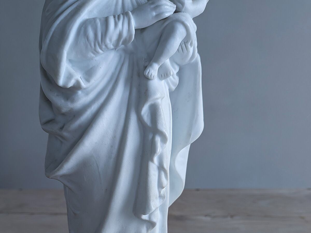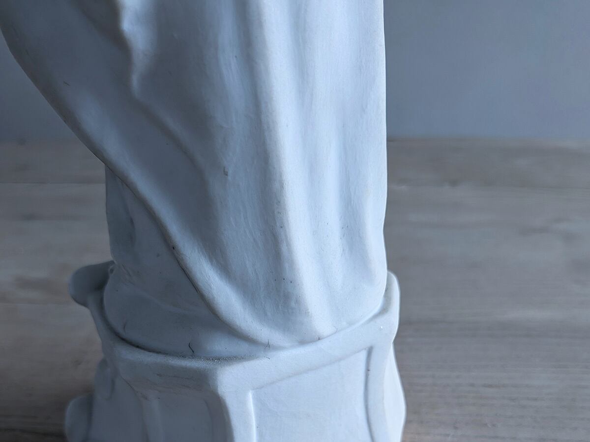 フランス19世紀ごろのビスクの聖母マリア像です。ビスクは高温で二度焼きした磁器で陶器と違って透明感があり繊細な表現が可能です。繊細な優しい顔立ちの美しいマリアす。状態は比較的綺麗です。