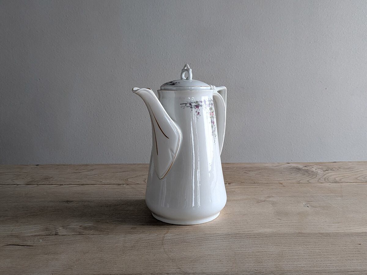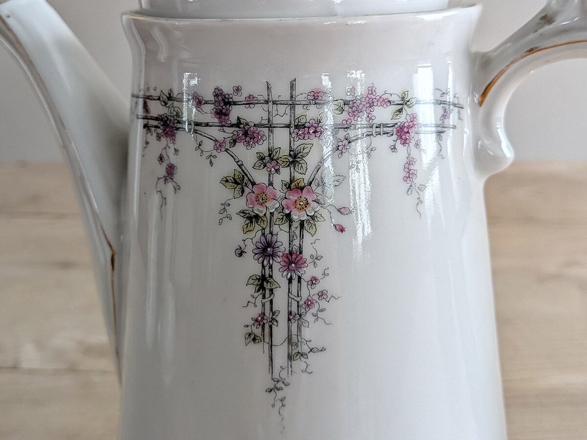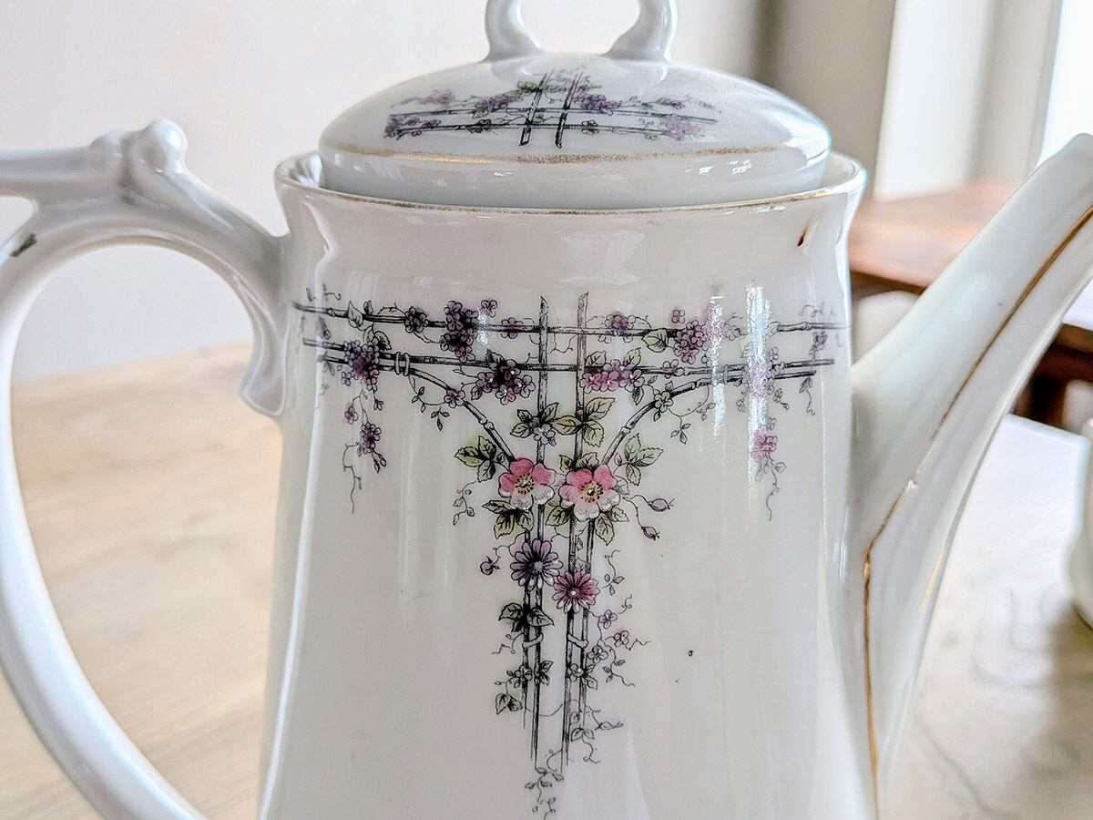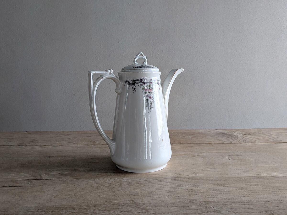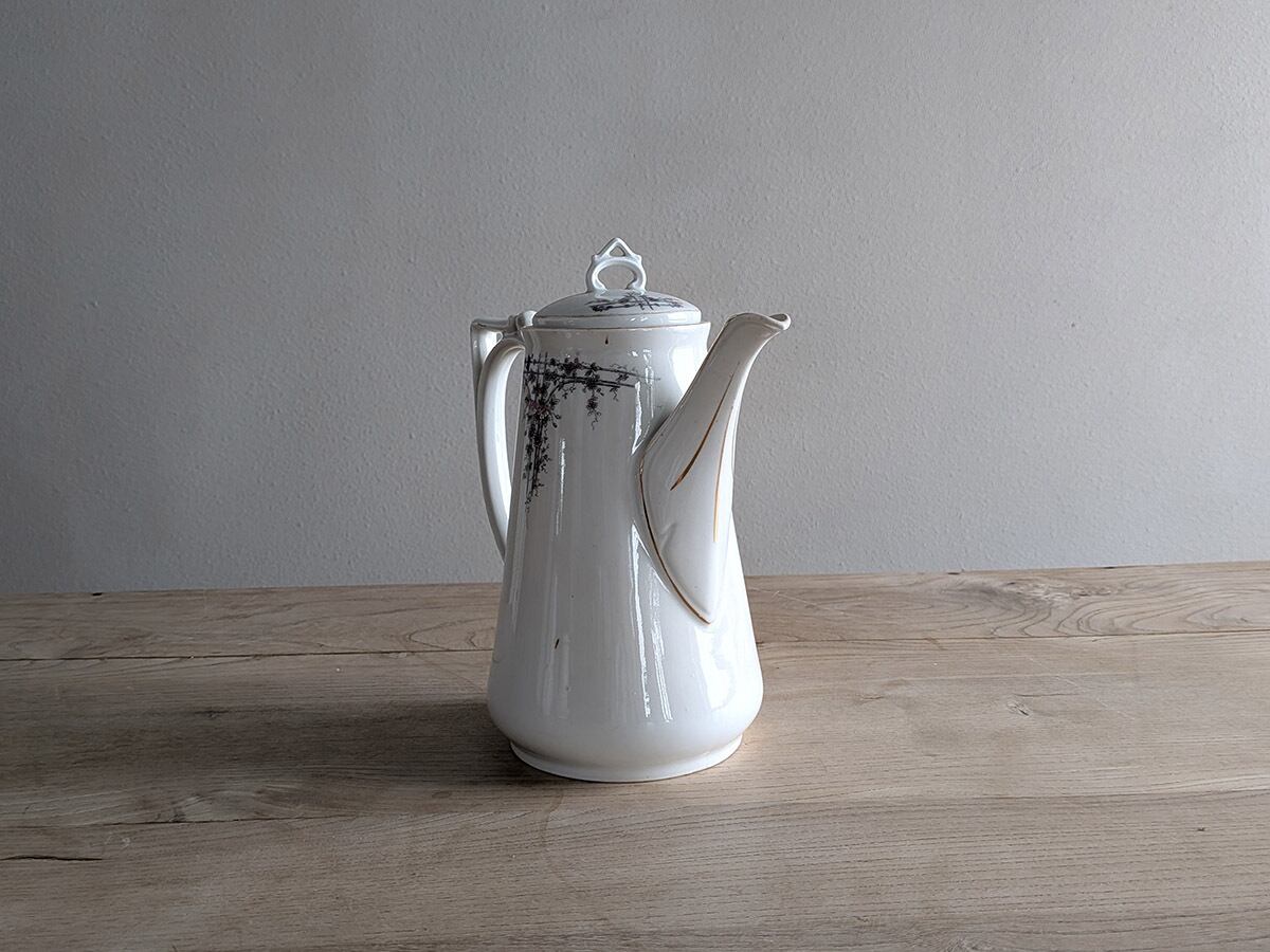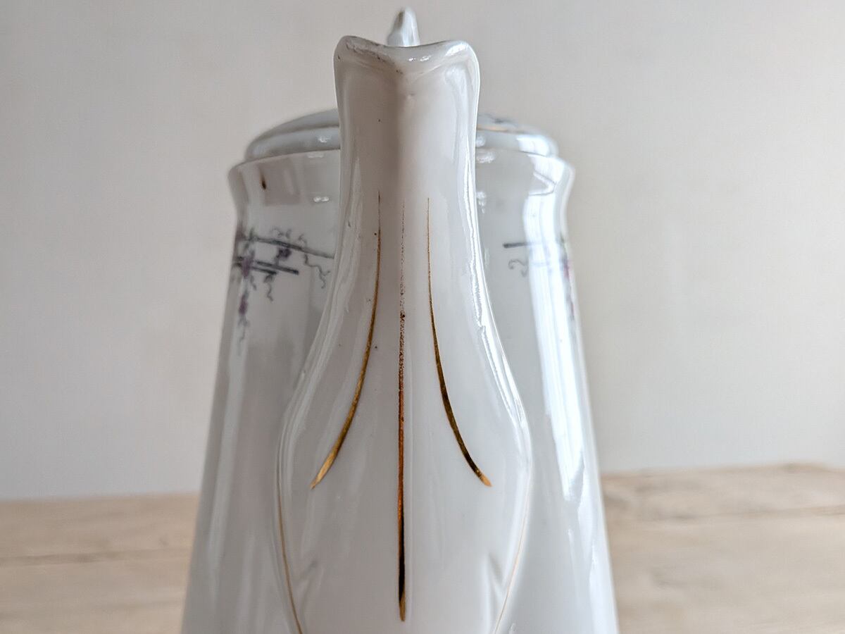 ドイツのアルトヴァッサーで1845年創業のCarl Robert Tielsch (カール・ティエルシュ 社)の繊細でクラシカルな雰囲気のコーヒーポットです。アンティーク特有の細かい傷がございますが、古いものの味わいとして楽しんでいただきたいです。この時代のものとしては比較的良い状態です。
