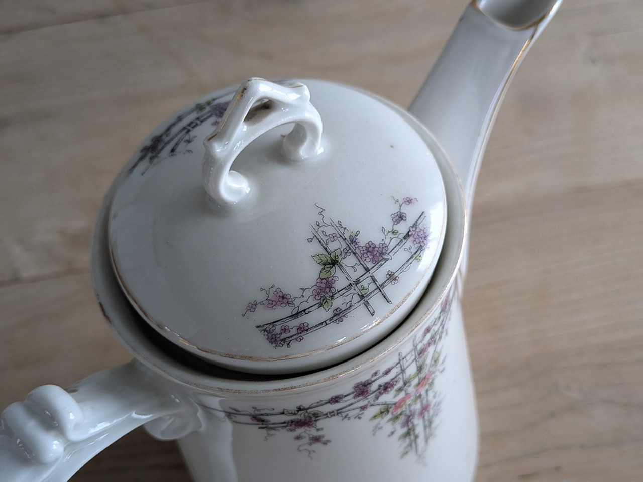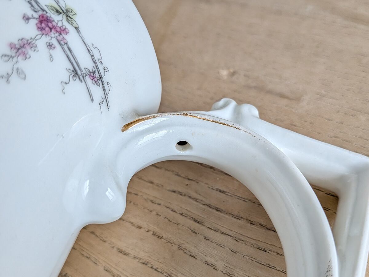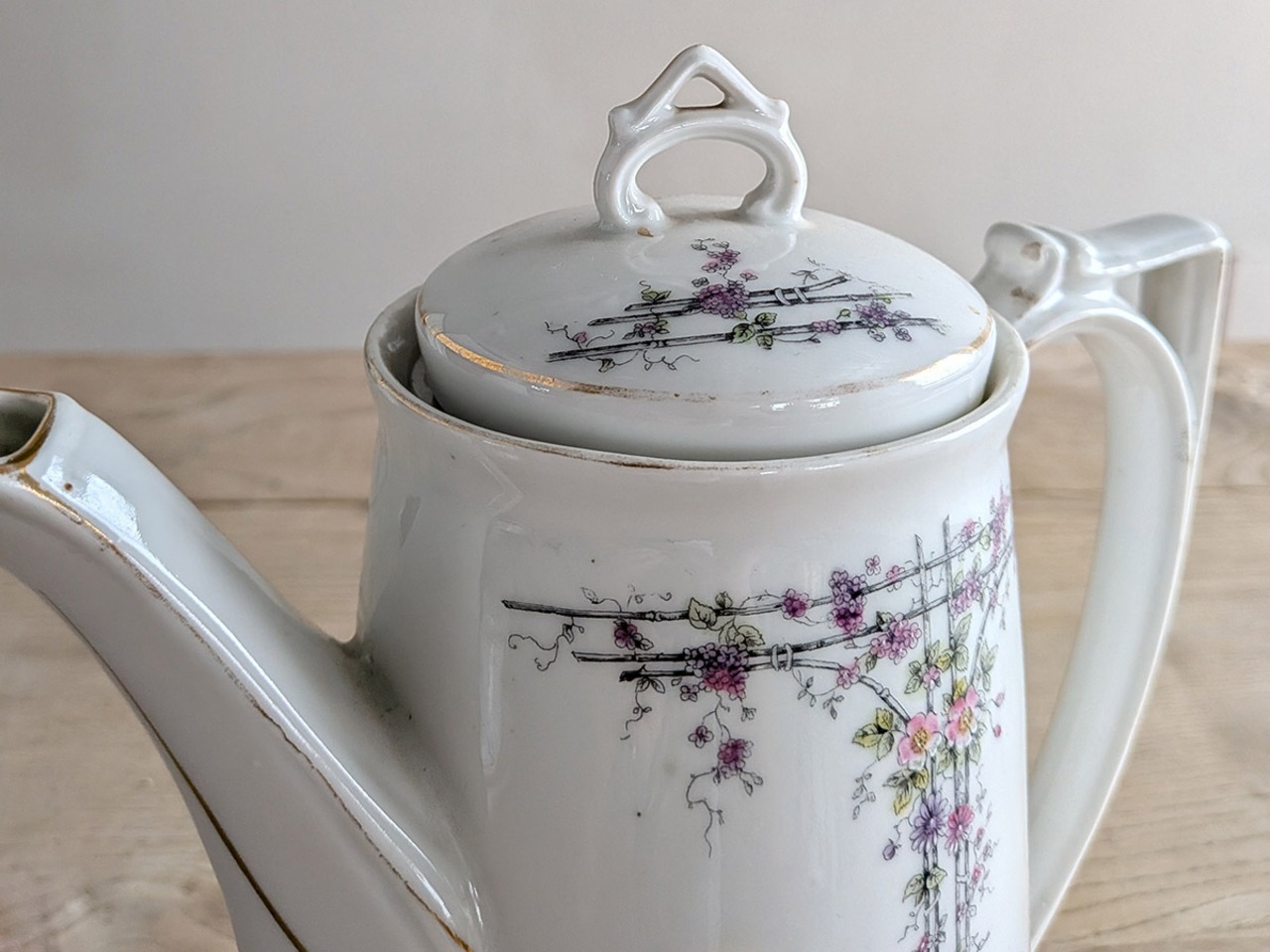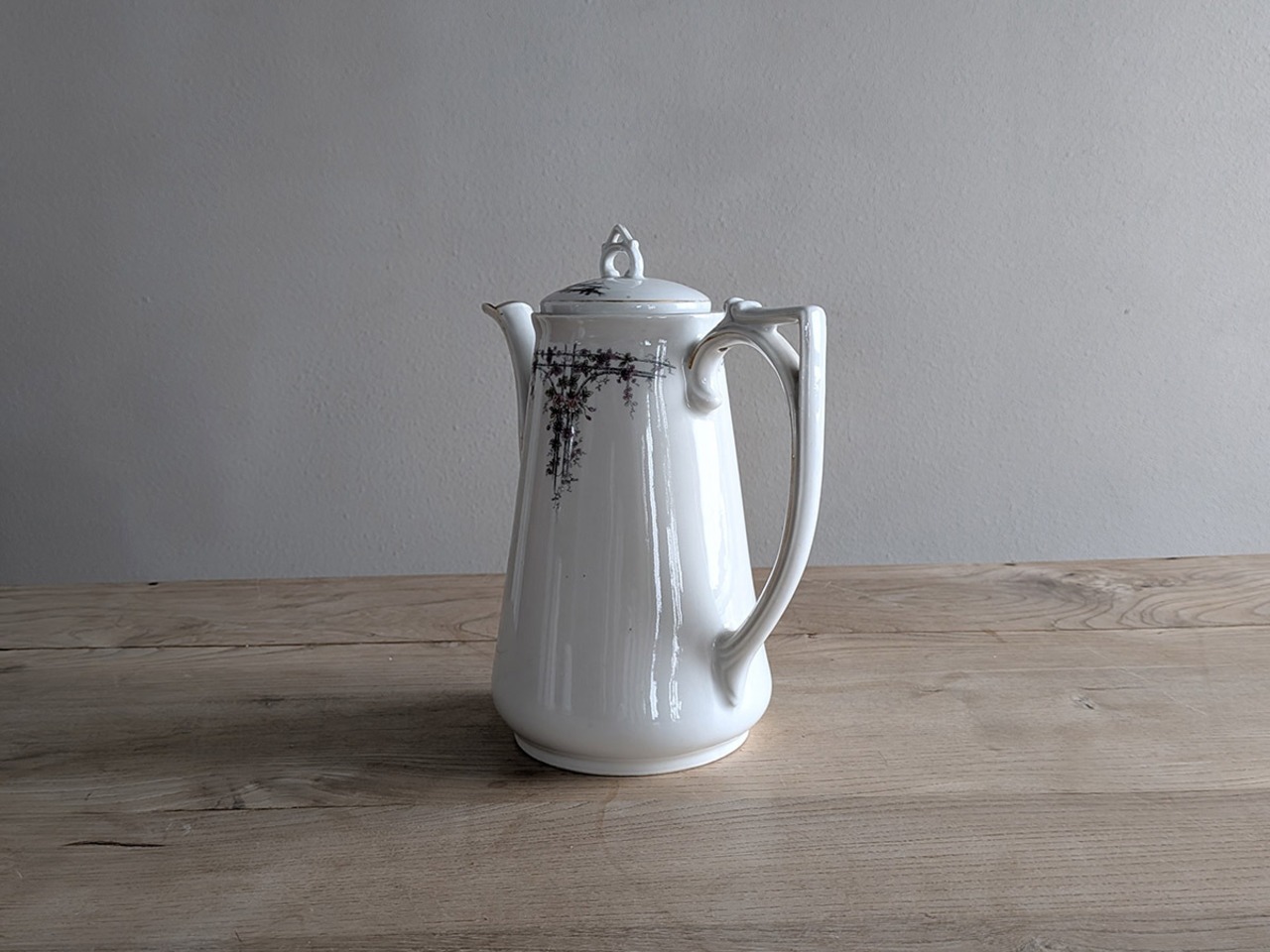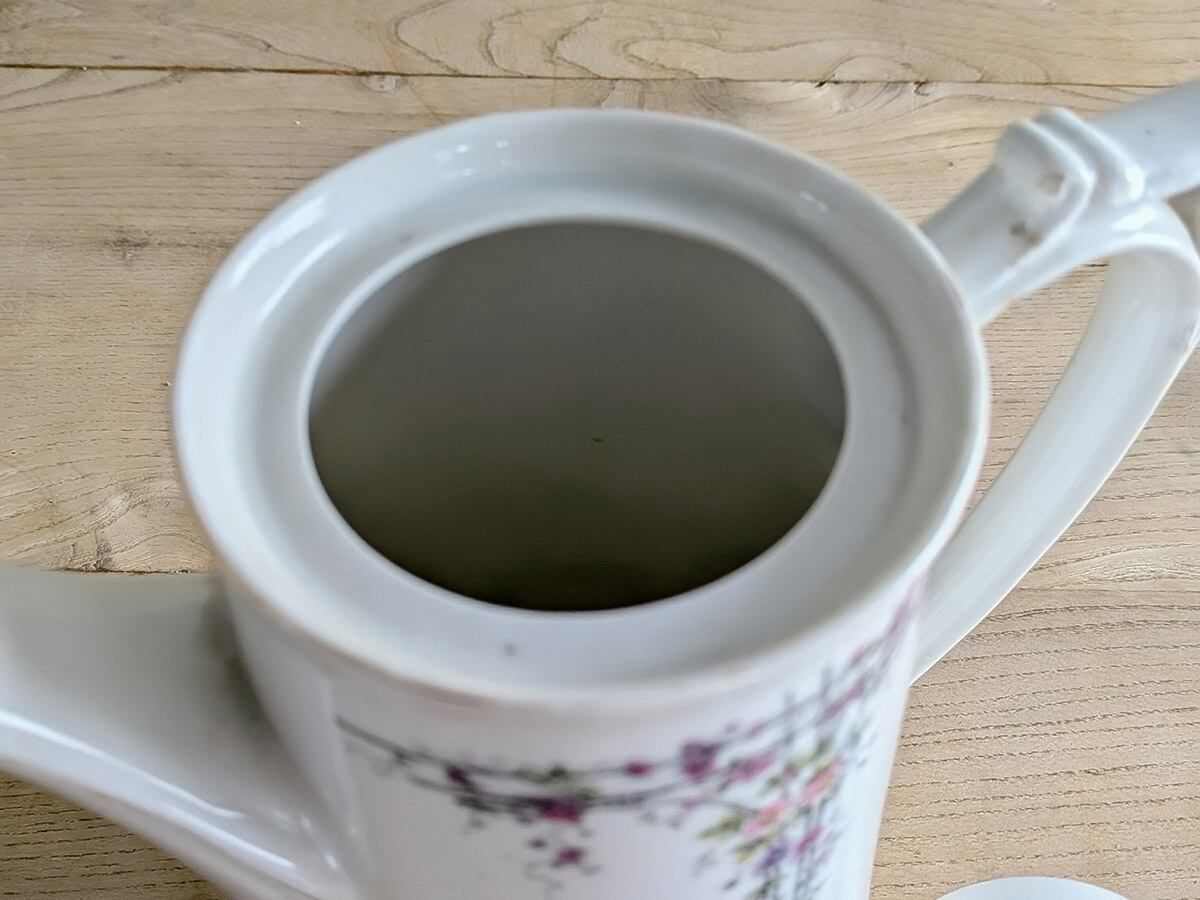 ドイツのアルトヴァッサーで1845年創業のCarl Robert Tielsch (カール・ティエルシュ 社)の繊細でクラシカルな雰囲気のコーヒーポットです。アンティーク特有の細かい傷がございますが、古いものの味わいとして楽しんでいただきたいです。この時代のものとしては比較的良い状態です。