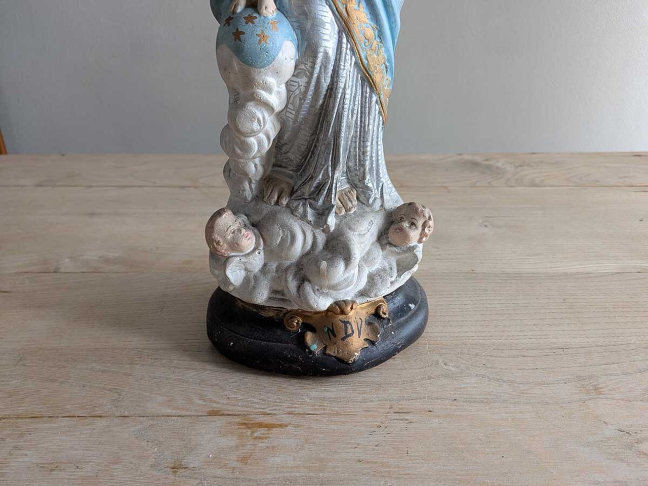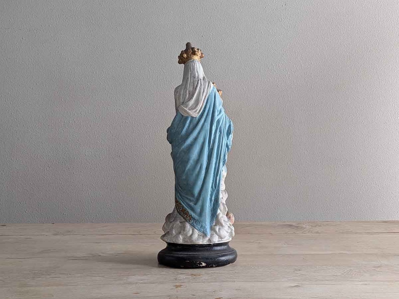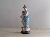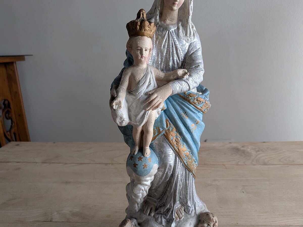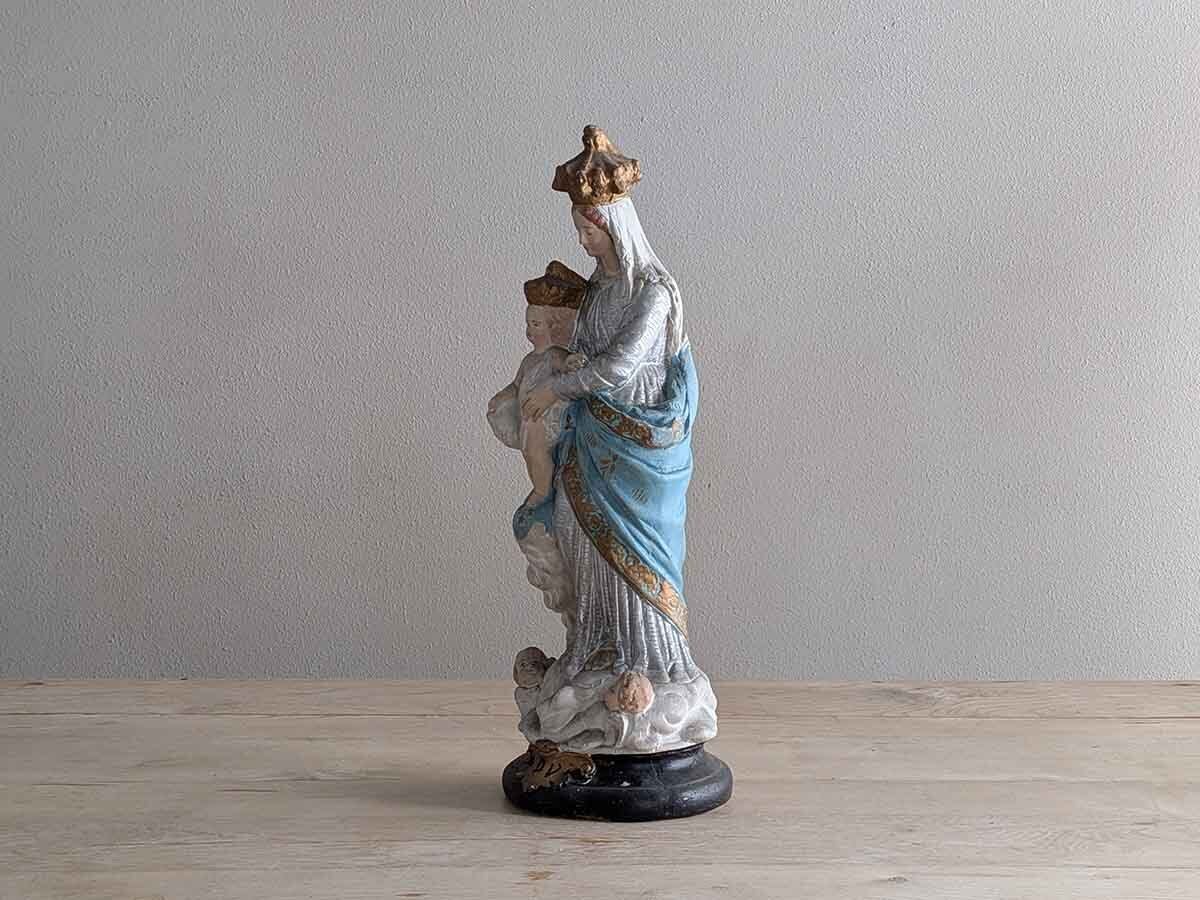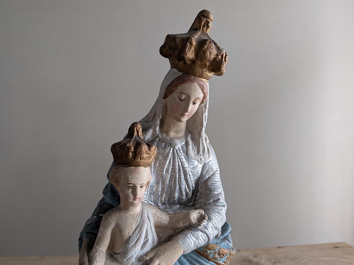 フランス1900年ごろの美しい石膏の聖母子像です。フランス・パリにある「ノートルダム・デ・ヴィクトワール教会の聖母子像(勝利の聖母)」がモチーフの石膏像です。1571年のレパントの海戦で強大なオスマン帝国軍に対し、キリスト教連合軍が聖母の加護を願った結果、劣勢を覆して勝利を収めたことから『勝利の聖母』と言われています。軍事的な勝利だけでなく、罪や誘惑、困難に対する勝利も意味しています。聖母マリアと幼子イエスの王冠は天の栄光と王権を象徴し、幼子の足元にある青い球体は全宇宙を意味してキリストが世界を支配していることを表しています。足元の二人の天使によって聖なるものを象徴しています。手作業で彩色された表情や色に職人のこだわりが感じられます。独特な石膏の質感や経年によるペイントの剥がれや傷が古いものならではの何とも言えない雰囲気が魅力です。