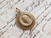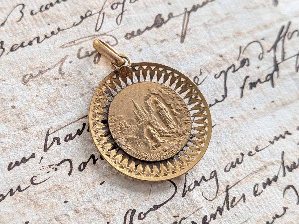 上品で華やかな印象の繊細なデザインのマリアのペンダントトップです。裏側の柄はルルドの聖母です。落ち着いた色のゴールドで存在感が有ります。カジュアルなコーディネートにもエレガントな装いにも合わせやすく日常の装いのアクセントとなることでしょう。刻印がございますが、読み取れませんので素材は不明です。おそらく真鍮に金メッキだと思われます。