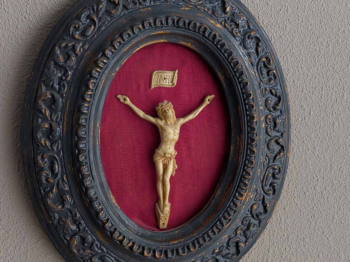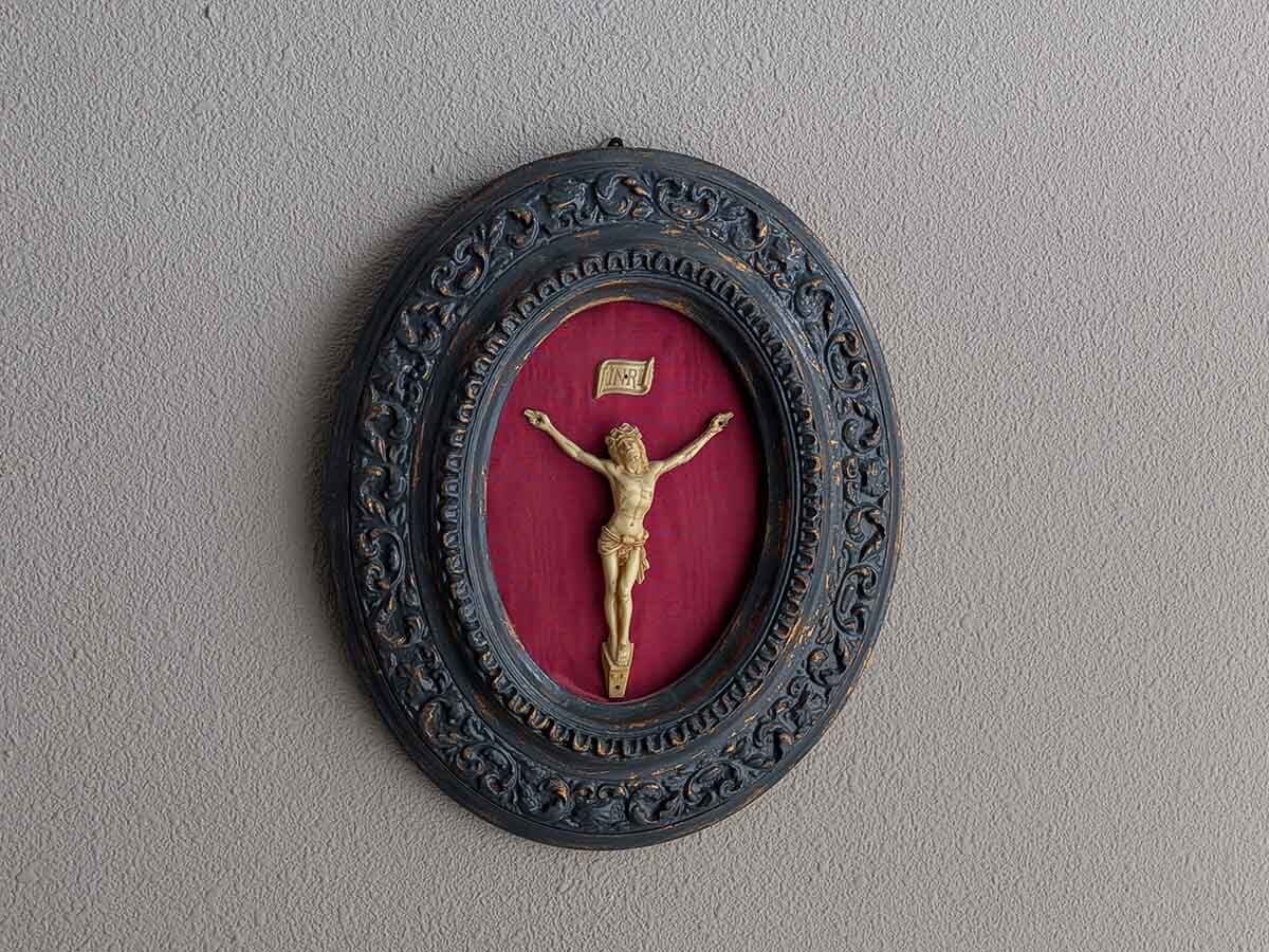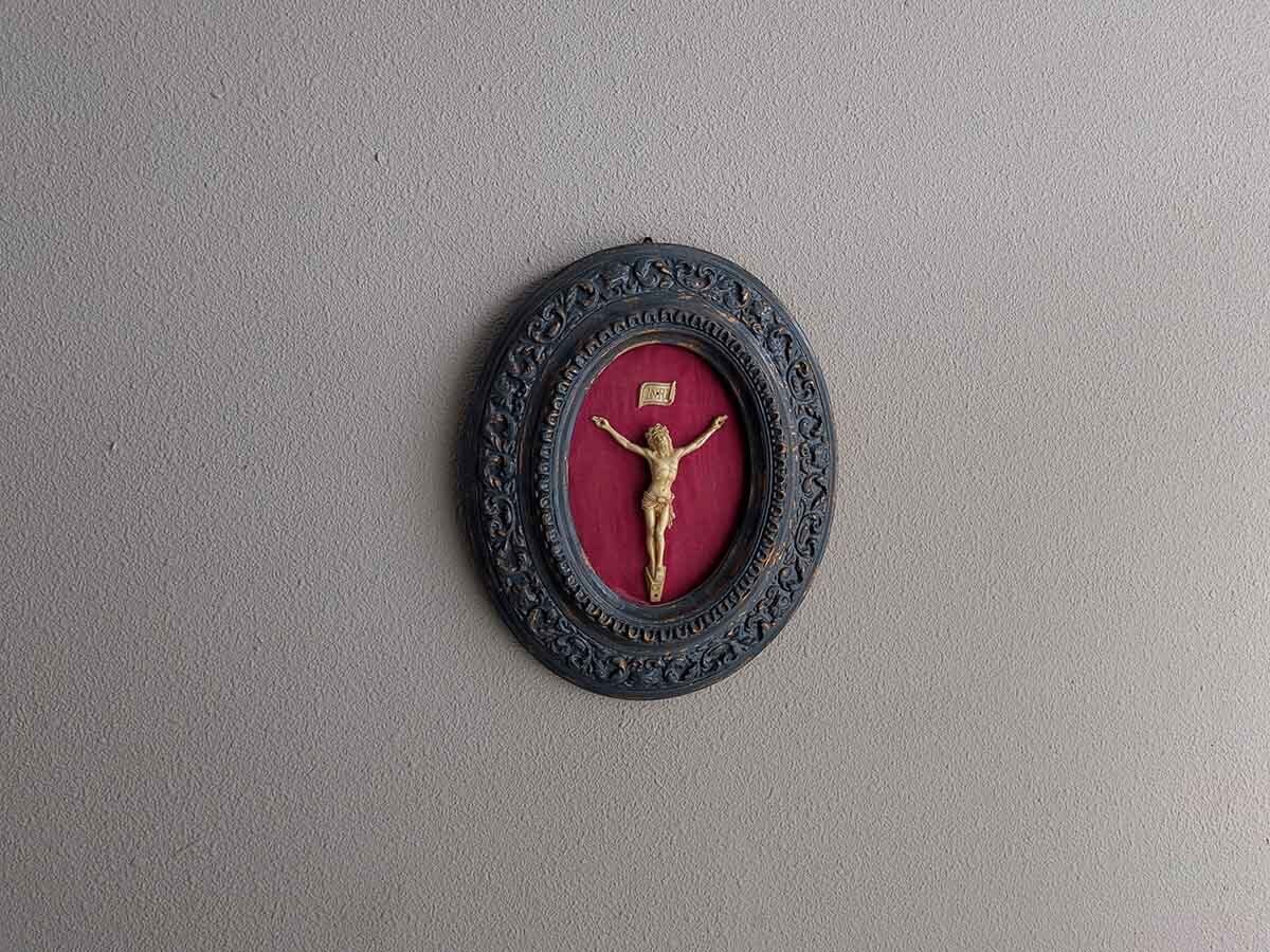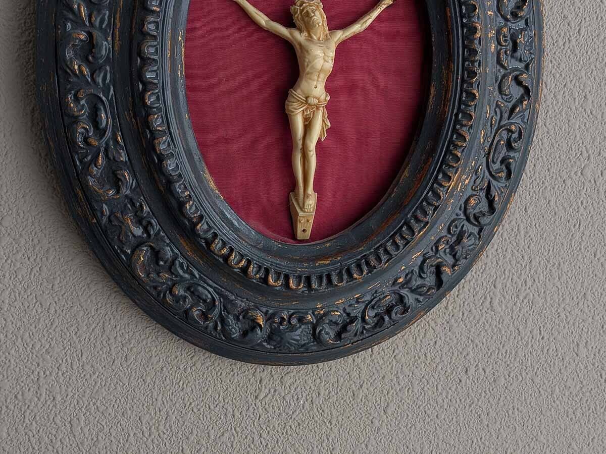 磔刑像が入ったフランスでみつけたアンティークのオーバルフレームです。磔刑像は人々を罪から救うために犠牲となったイエスの愛と、その苦難を表したもので、キリスト教において最も重要な偶像です。『ナザレのイエス、ユダヤ人の王』を意味する『INRI』の文字がございます。教会の祭壇、家庭や個人の祈りの場に置かれています。こちらの金属に見えるフレームは石膏に銅色の塗料の上に青黒っぽい塗料が塗られて使い込まれた銅板のような色合いです。像の背景にはキリストの流血を象徴した赤色の布が張られています。象牙を模した磔刑像はおそらく19世紀末から20世紀初頭に普及した天然由来のカゼインプラスチック(ラクト樹脂)で作られていると思われます。
