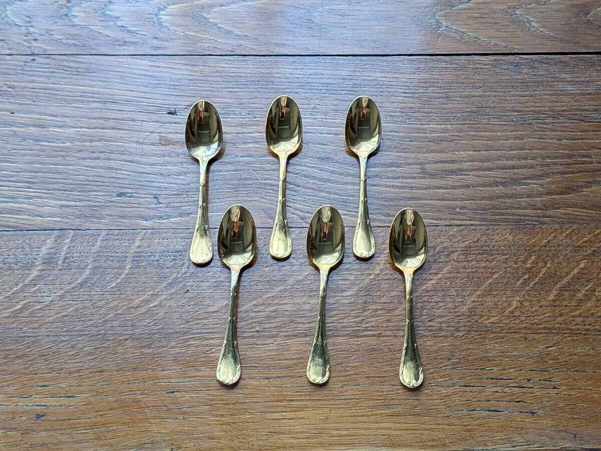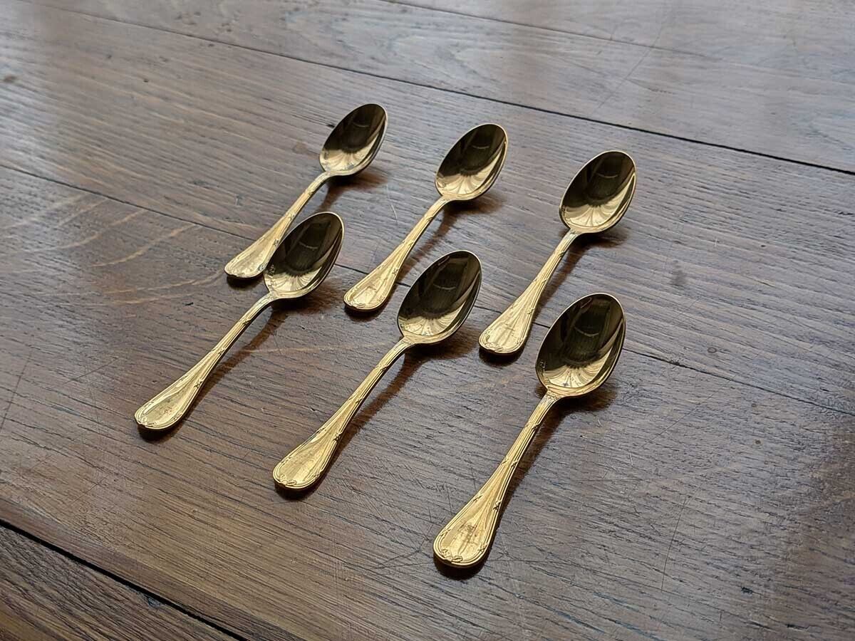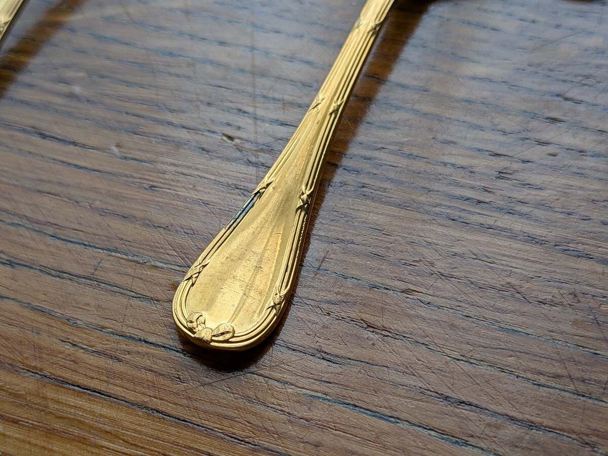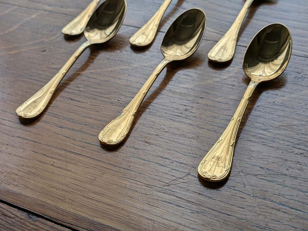 クリストフルのリボンを意味するRubans(リュバン)というシリーズのコーヒースプーンです。その名のとおり、リボン柄のシンプルなデザインにゴールドメッキが施されています。エレガントな印象のスプーンです。華やかな輝きはテーブルを上質な雰囲気に演出してくれます。アンティーク特有の細かい傷はございますが、比較的綺麗な状態です。価格は一つのお値段です。
