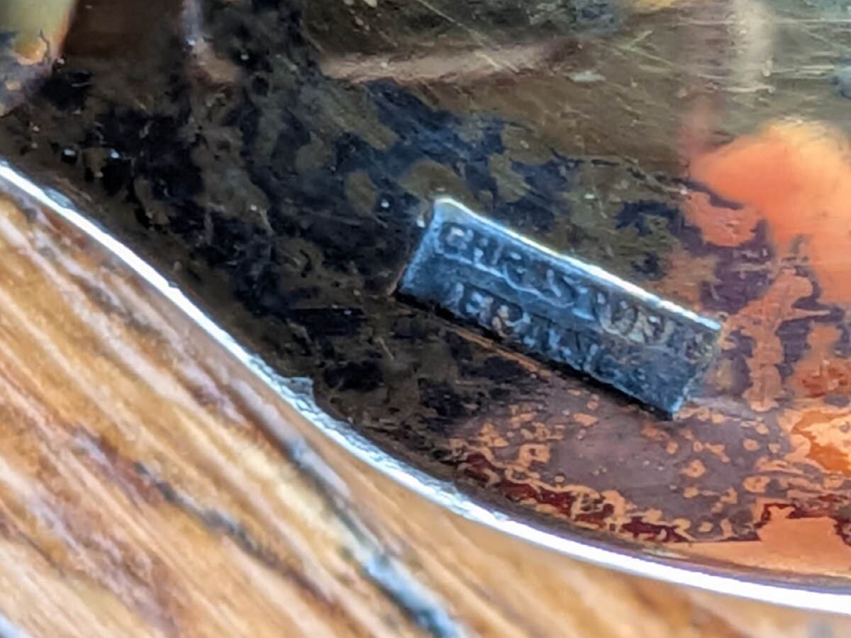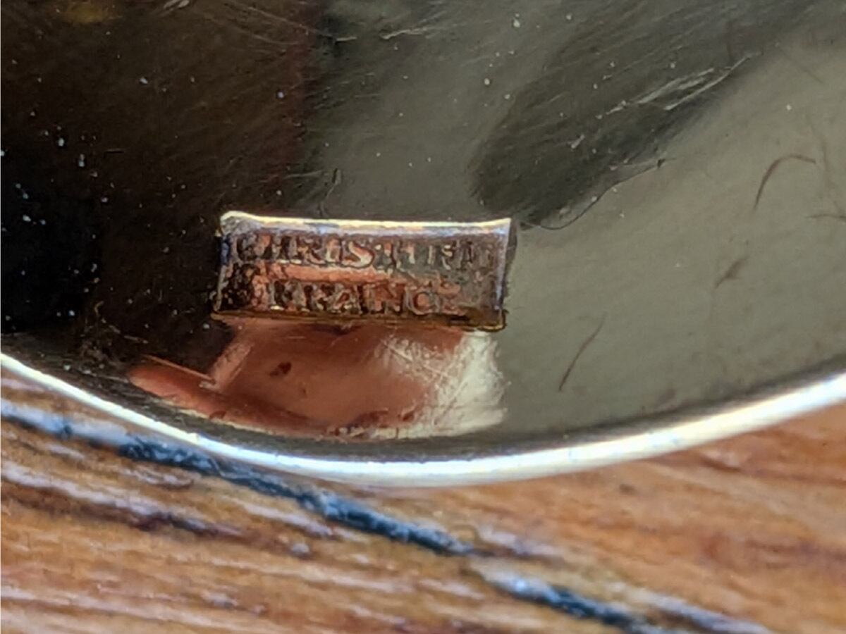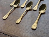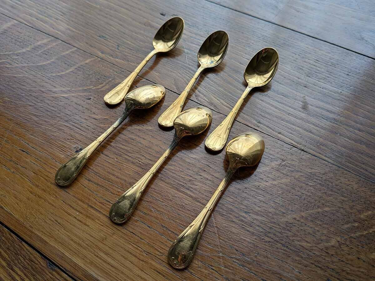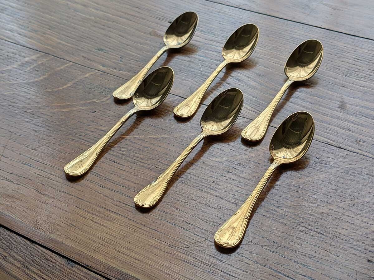 クリストフルのリボンを意味するRubans(リュバン)というシリーズのコーヒースプーンです。その名のとおり、リボン柄のシンプルなデザインにゴールドメッキが施されています。エレガントな印象のスプーンです。華やかな輝きはテーブルを上質な雰囲気に演出してくれます。アンティーク特有の細かい傷はございますが、比較的綺麗な状態です。価格は一つのお値段です。