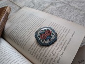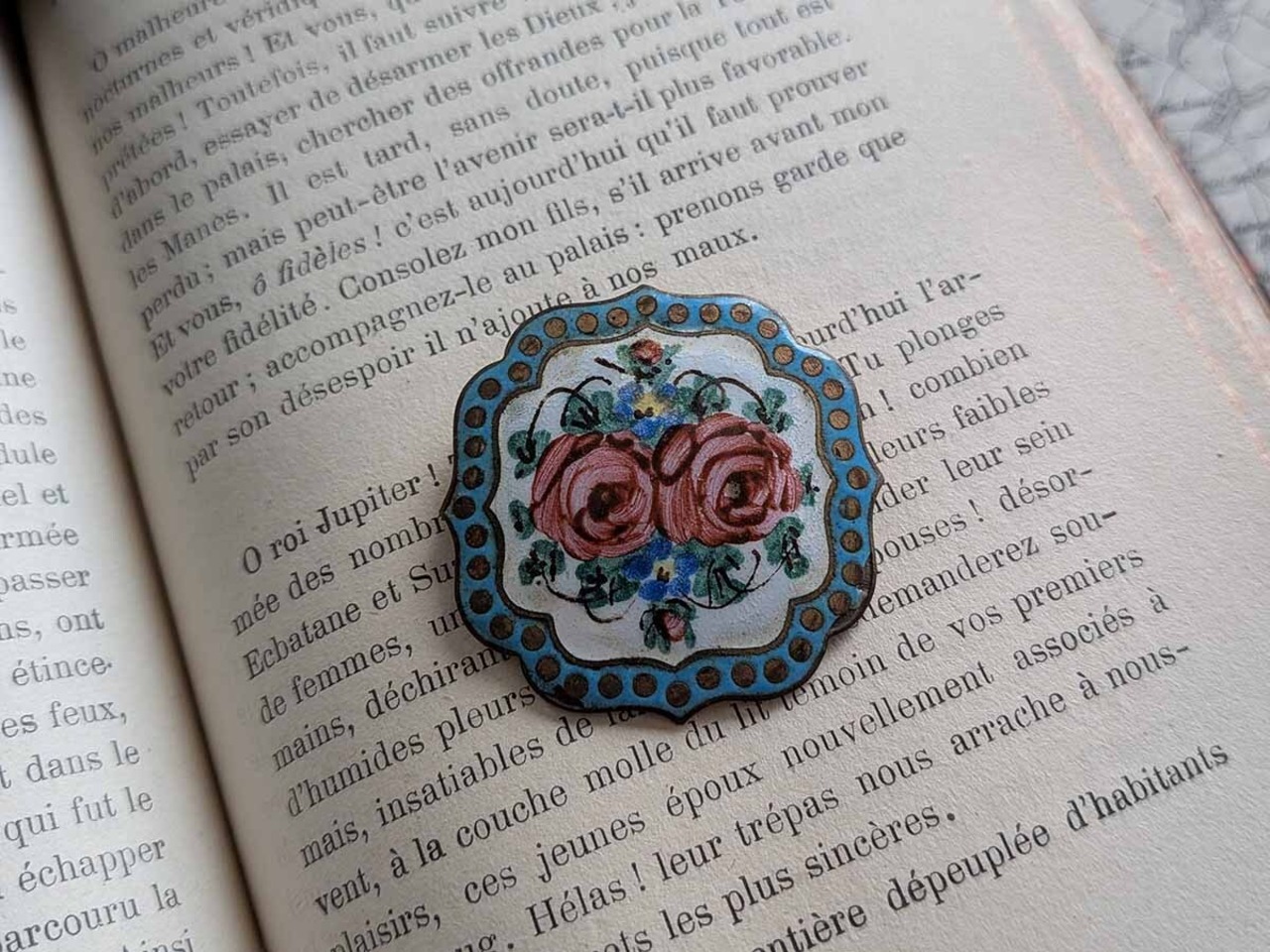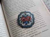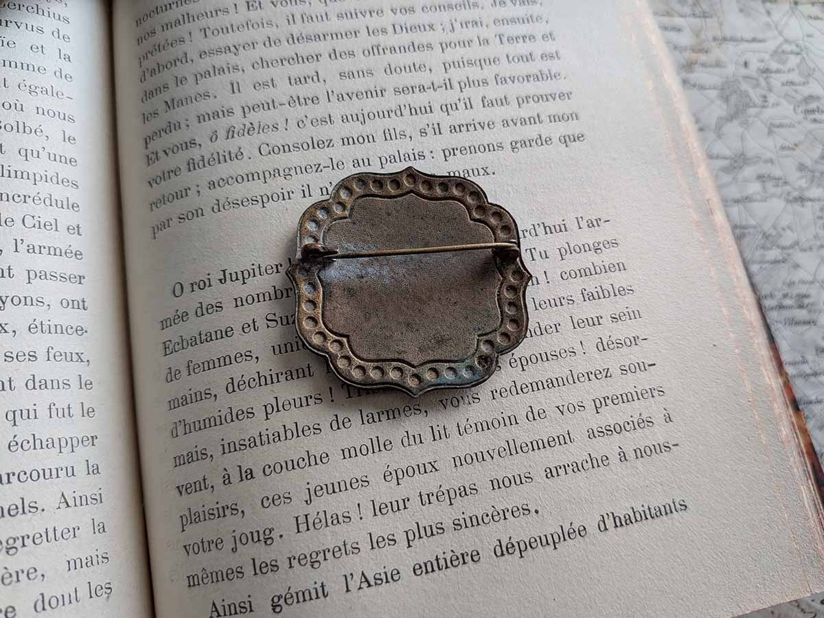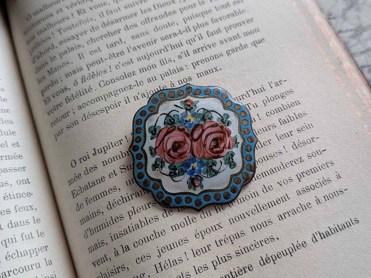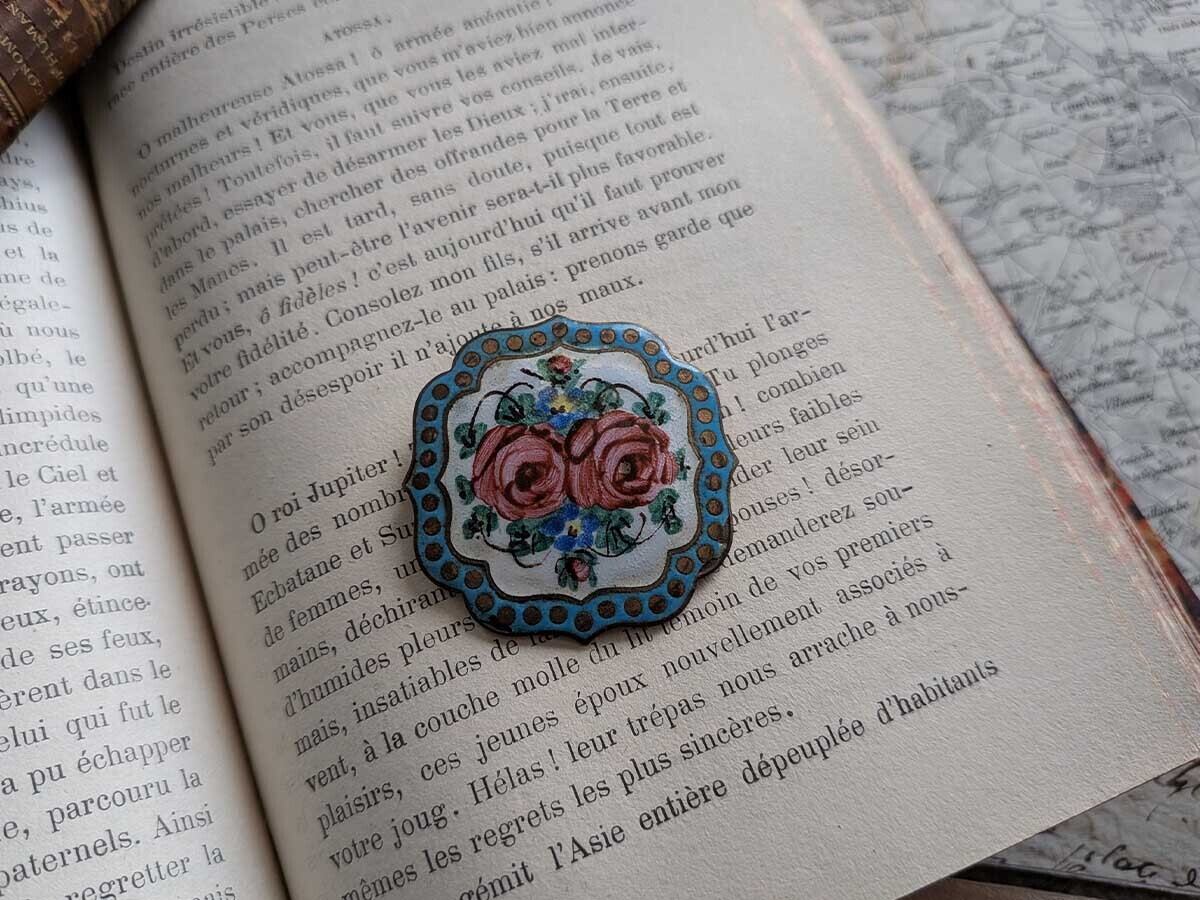 真鍮の土台に薔薇の絵が描かれたフランスの美しいブローチです。アンティーク特有の細かい傷がございます。