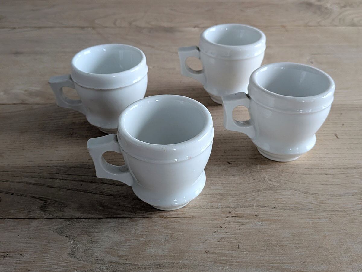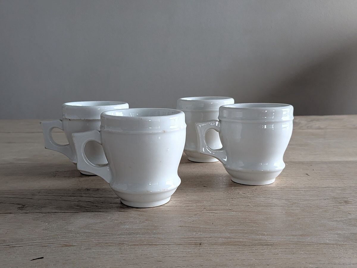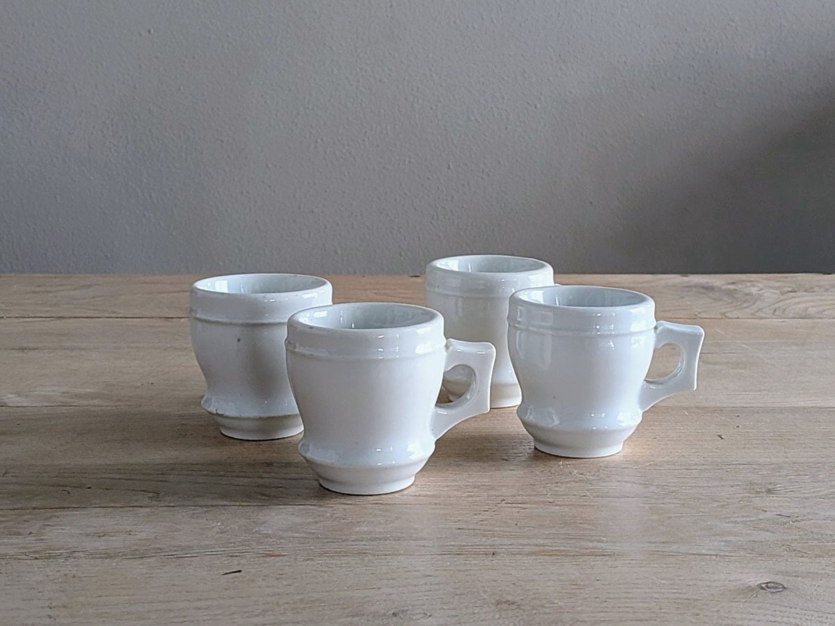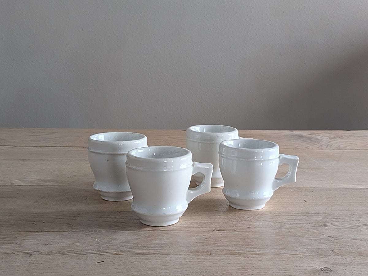 フランスの1880年頃のブリュロと呼ばれるカップ。カフェやビストロで、濃い目のコーヒーを飲んだ後の温かいカップを裏返して、凹みにアルコールを注いでいたそうです。ぽってりとしたカップがレトロな雰囲気です。価格は1客のお値段です。