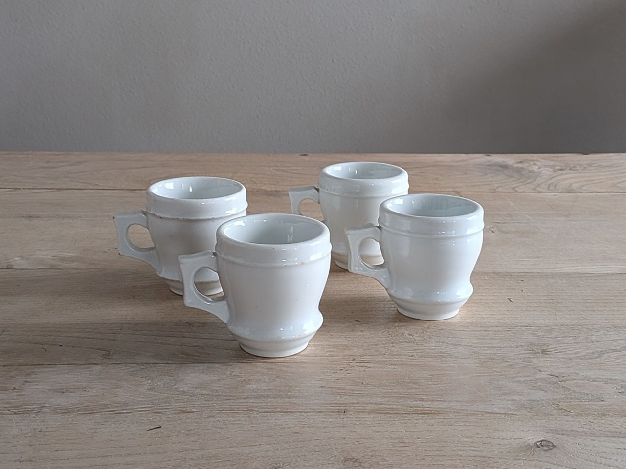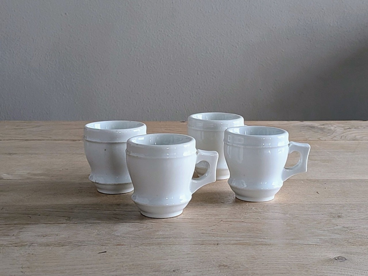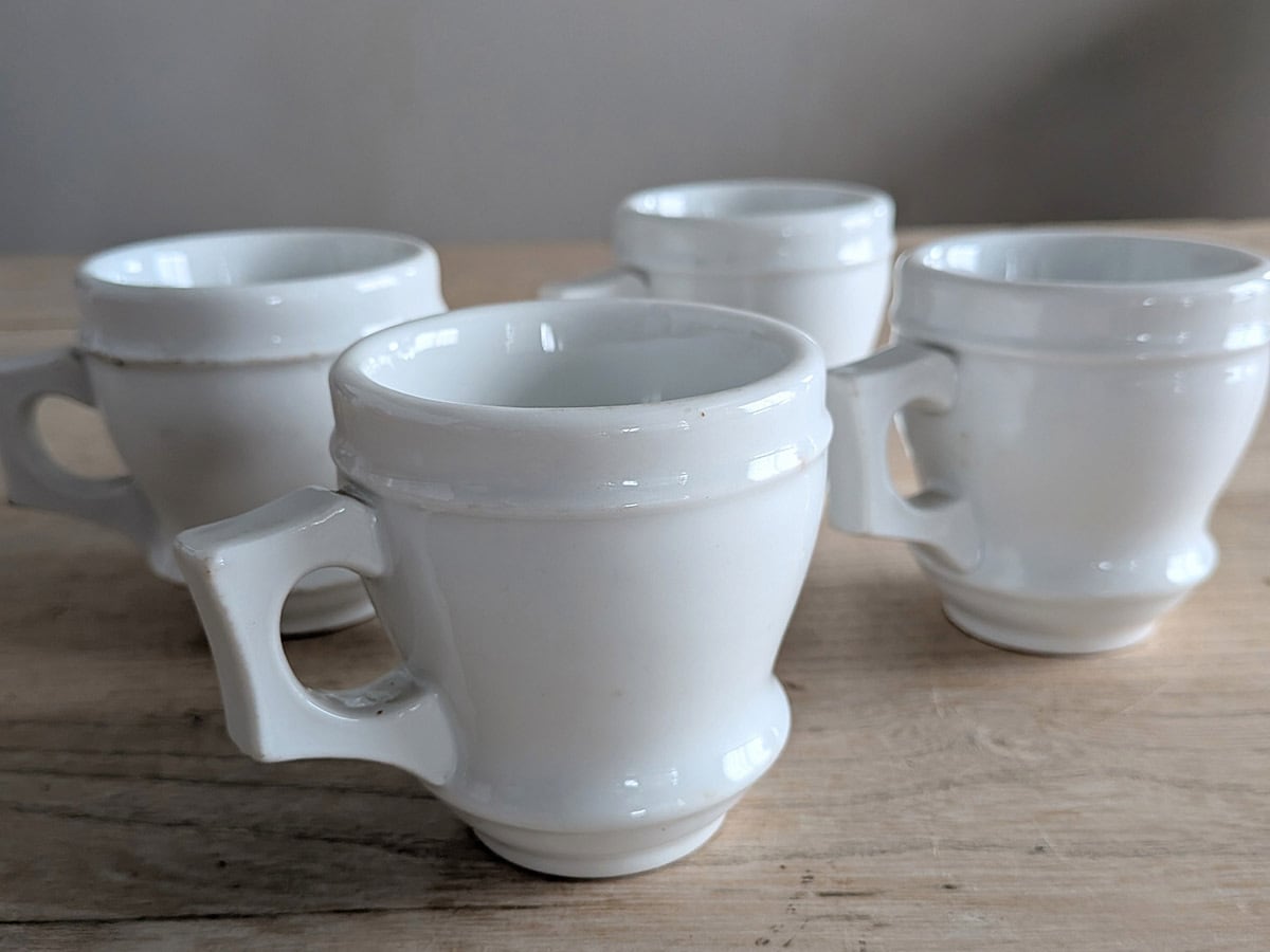 フランスの1880年頃のブリュロと呼ばれるカップ。カフェやビストロで、濃い目のコーヒーを飲んだ後の温かいカップを裏返して、凹みにアルコールを注いでいたそうです。ぽってりとしたカップがレトロな雰囲気です。価格は1客のお値段です。