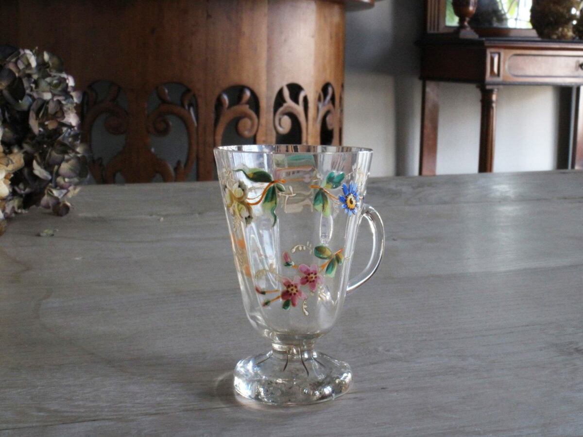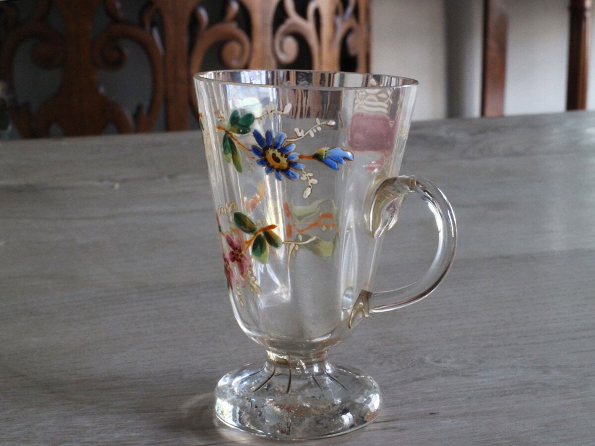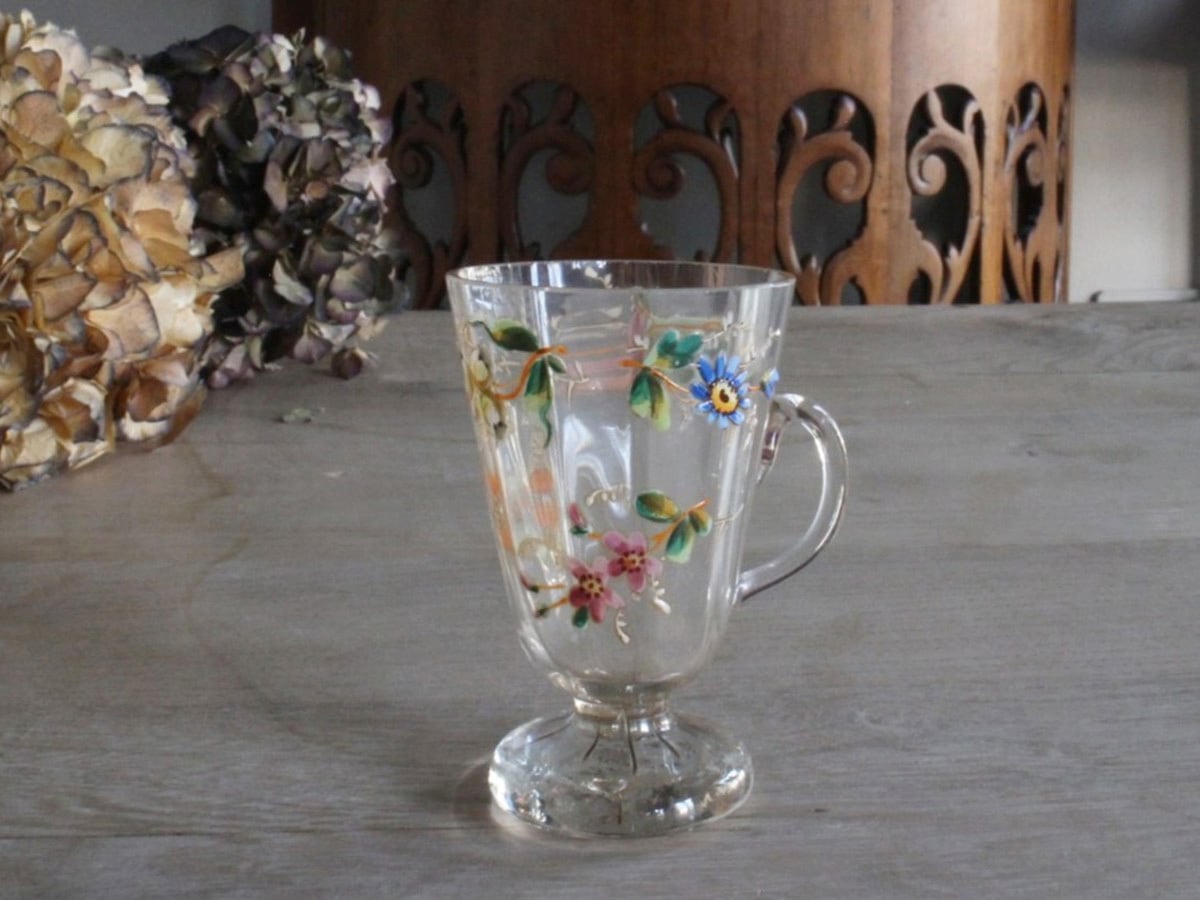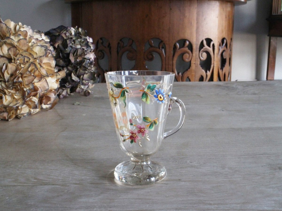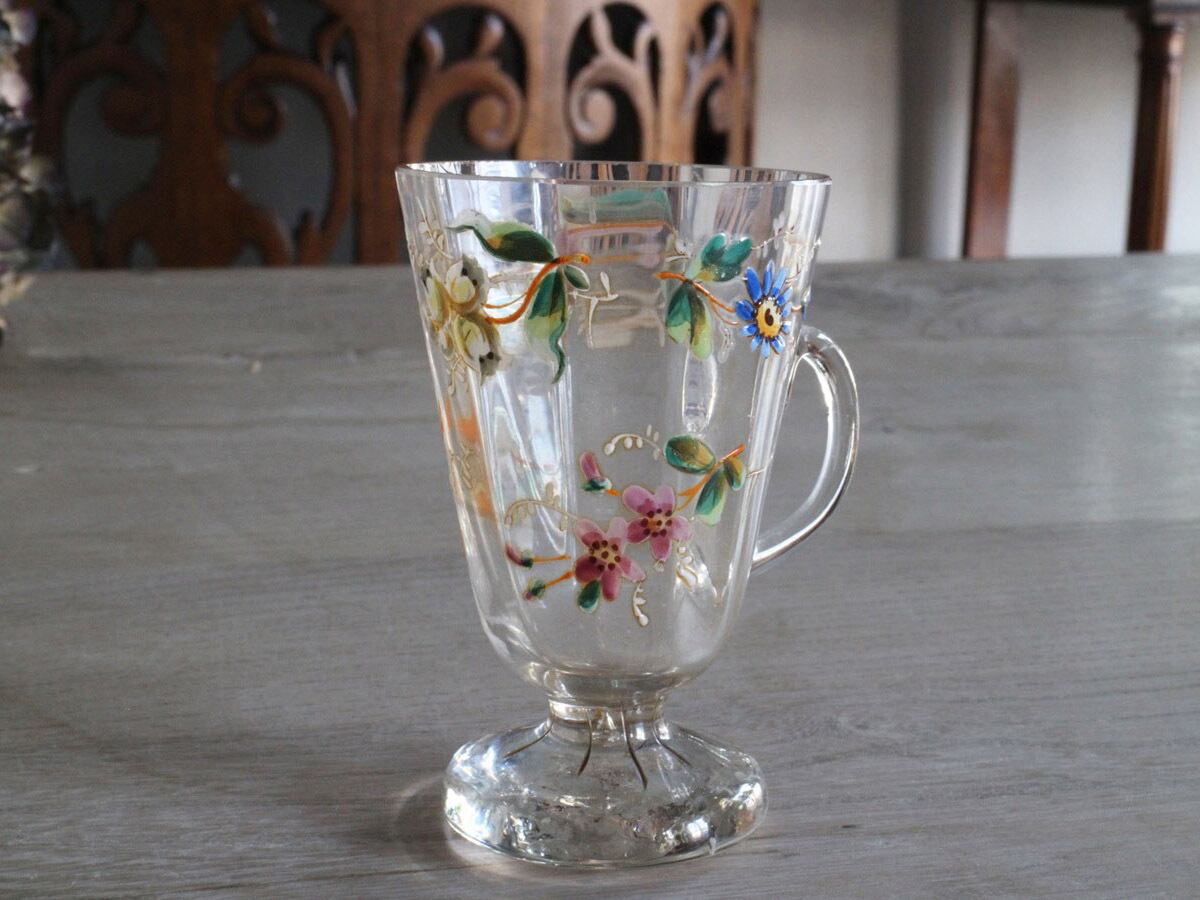エナメル彩によってお花が描かれた可愛らしいフランスの取っ手付きのグラスです。スズランや矢車草のようなブルーのお花など、とても丁寧に描かれていて手作りのグラスの温かみが感じられます。口の部分に製造時のものと思われる細かいチップやアンティーク特有の細かい傷はございますが、ヒビはございません。底面が平らでは無いため、置いた時にカタカタしますが、布のコースターなどを使用すると気にならなくなります。