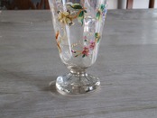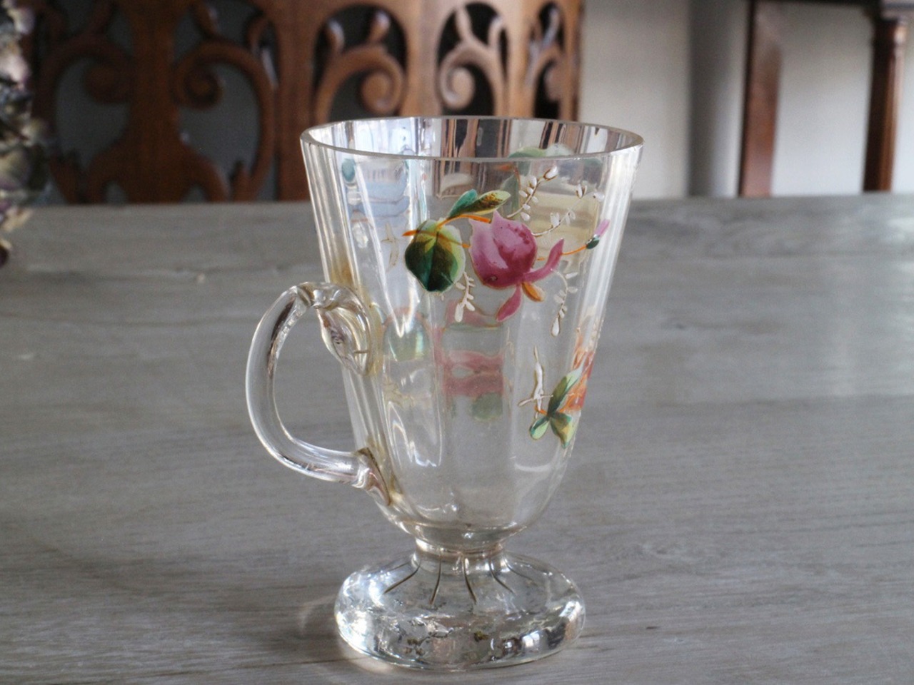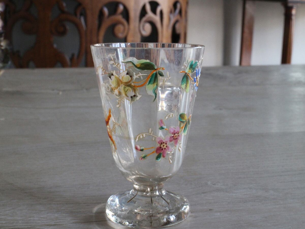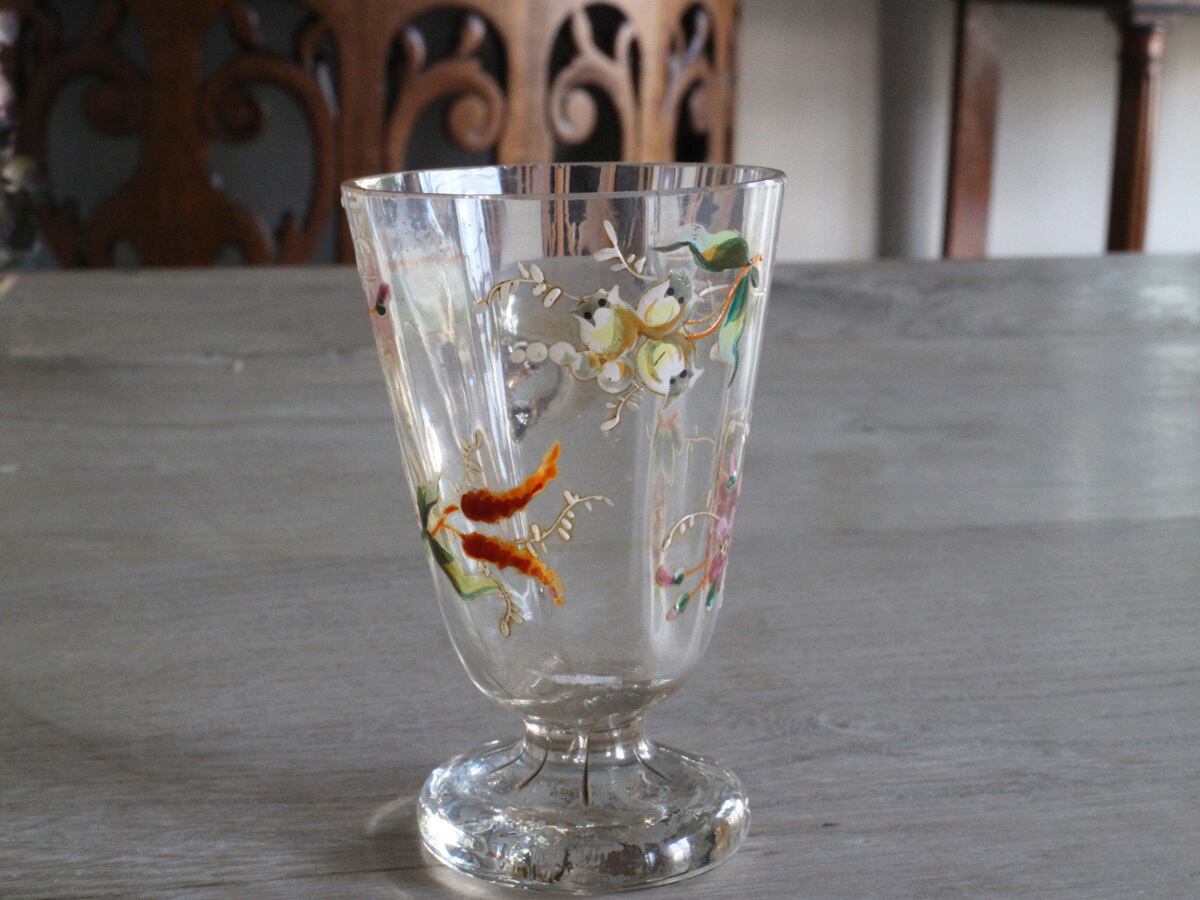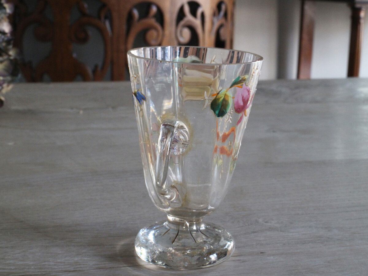 エナメル彩によってお花が描かれた可愛らしいフランスの取っ手付きのグラスです。スズランや矢車草のようなブルーのお花など、とても丁寧に描かれていて手作りのグラスの温かみが感じられます。口の部分に製造時のものと思われる細かいチップやアンティーク特有の細かい傷はございますが、ヒビはございません。底面が平らでは無いため、置いた時にカタカタしますが、布のコースターなどを使用すると気にならなくなります。