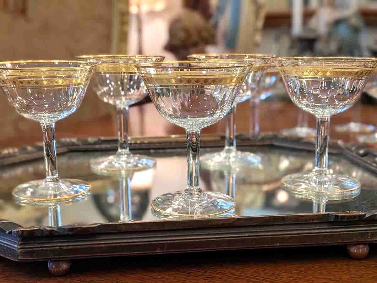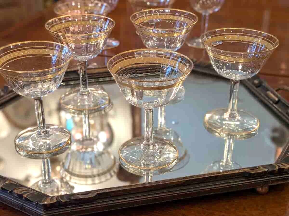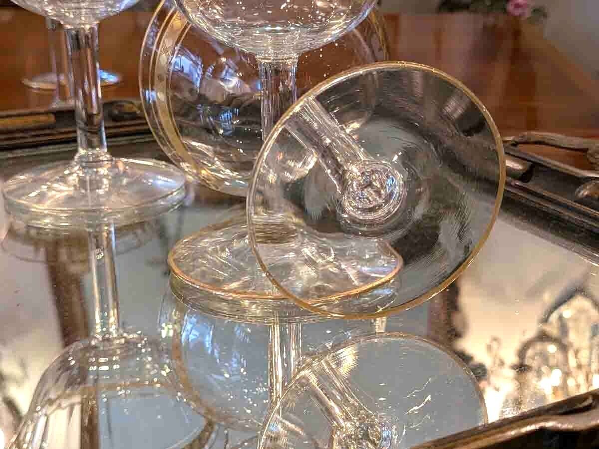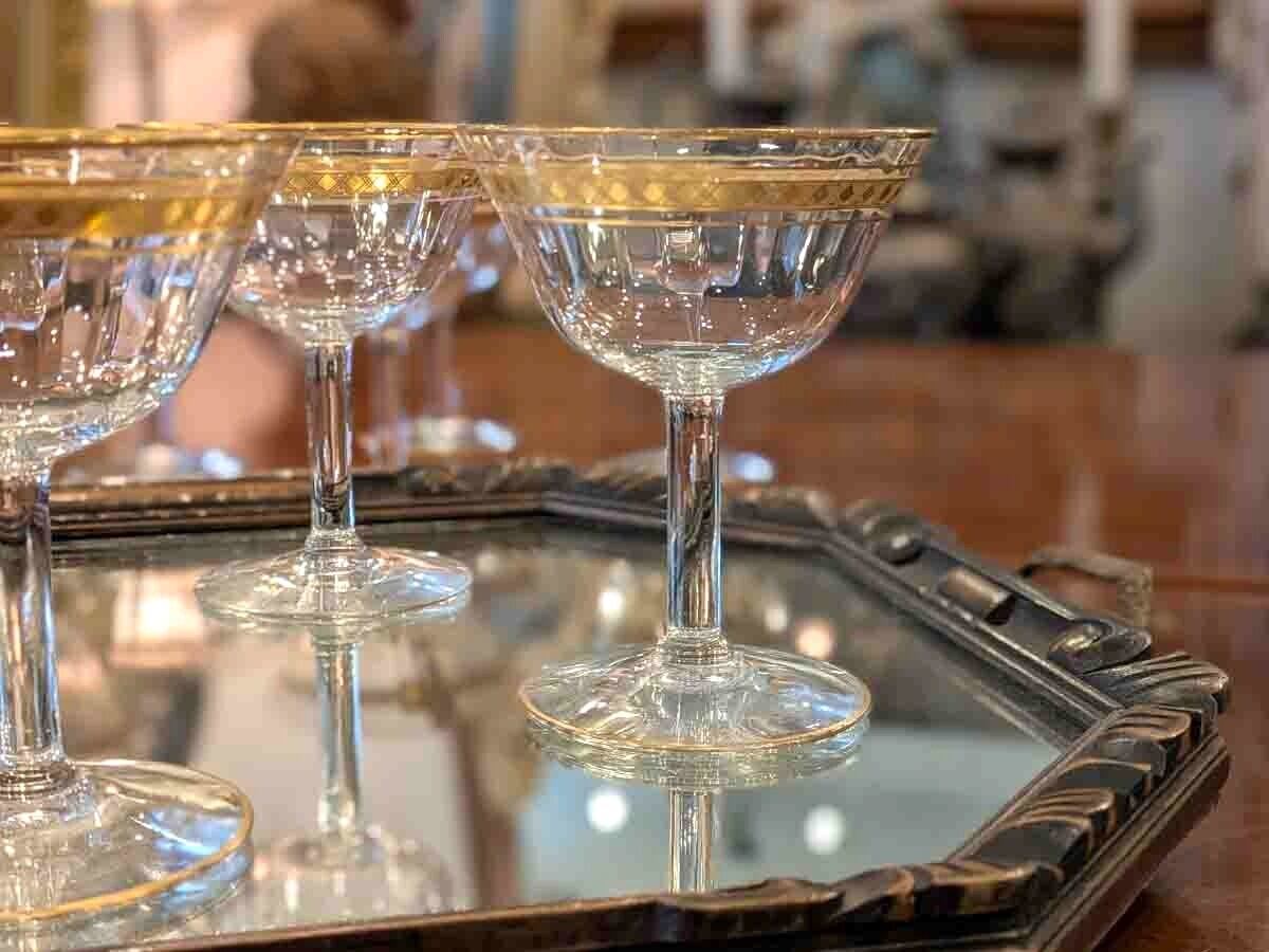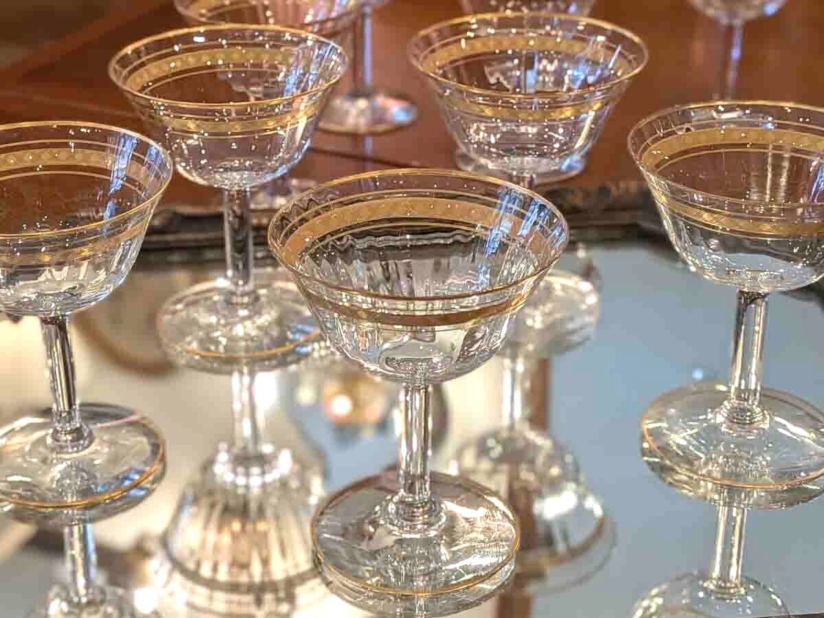 フォストリア社は1887年にアメリカのオハイオ州フォストリアで創業し、その後ウェストバージニア州マウンドビルへ移転しました。吹きガラス、プレス加工、手作業によるエッチング、そして豪華な金彩などの装飾技法に優れ、1920年代から1950年代にかけて「エレガントグラス」と呼ばれる高品質なハンドメイド・ガラス製品で一世を風靡しました。 多くの製品には24%のリードクリスタルが含まれており、高い透明度と、指で弾いた時の澄んだ音色が特徴です。アイゼンハワー大統領からレーガン大統領まで、歴代のアメリカ大統領がホワイトハウスで使用するために注文していたことでも知られる非常に格式高いブランドです。繊細なエッチング模様を施した後に純金を焼き付ける「ゴールド・エンクラスティッド(Gold Encrusted)」という技法が用いられています。波打つようなガラスが光を美しく反射し、重厚な輝きを放ちます。 フォストリア社は1986年に工場を閉鎖しているため、現在目にすることができる金彩グラスは、すべて当時の貴重なヴィンテージ・アンティーク品となります。金彩の剝れなどがございますが、比較的綺麗な状態です。