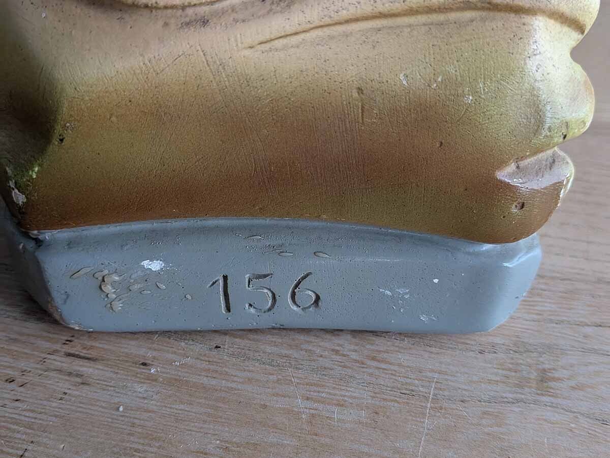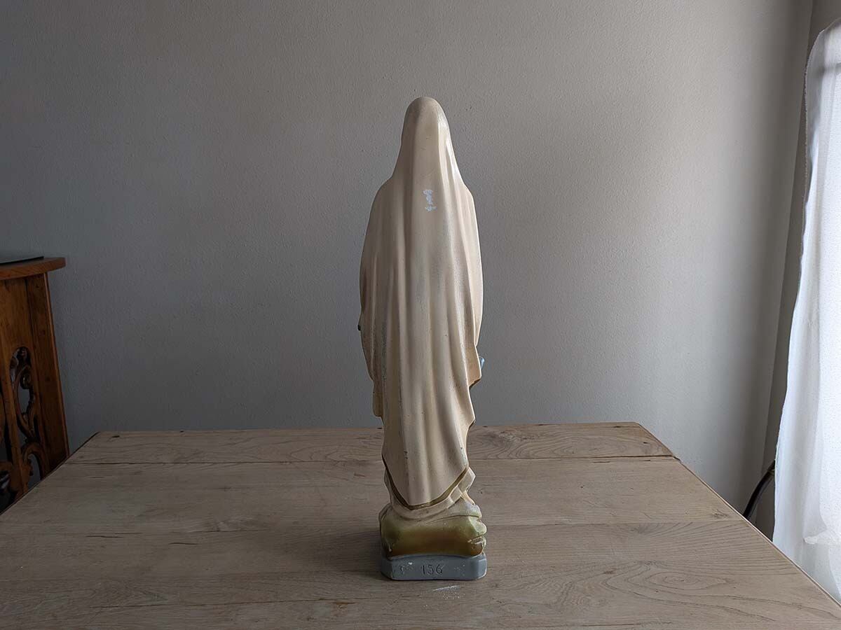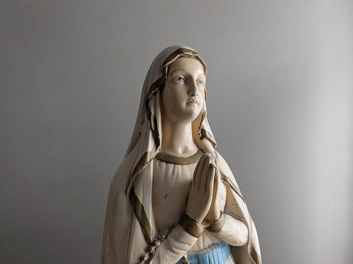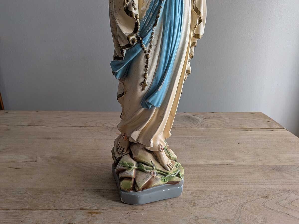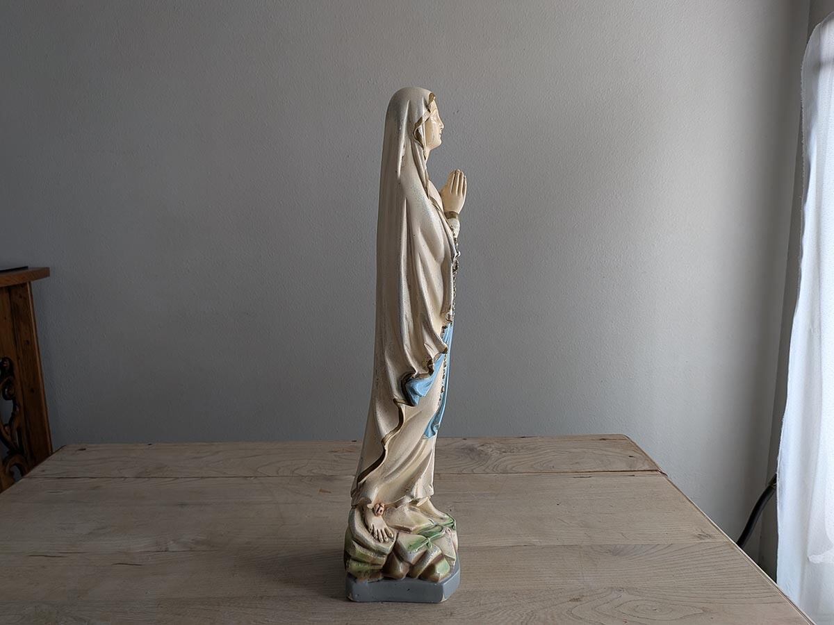 フランスでみつけた石膏の「ルルドの聖母」の聖母マリア像です。1858年フランスの聖地ルルドで少女ベルナデッタの前に現れた姿を模したこの石膏像は、純潔を示す白い衣に水色の帯を締め手にロザリオを携えて祈る姿が特徴で、足元には出現の証とされる黄金色の薔薇が咲いています。多くの病を癒やした「奇跡の泉」の象徴として今も世界中の人々に希望と深い信仰、そして心身の癒やしを与え続けています。独特な石膏の質感、手作業で彩色された表情や色、経年によるペイントの剥がれや傷がございますが、古いものならではの何とも言えない雰囲気です。