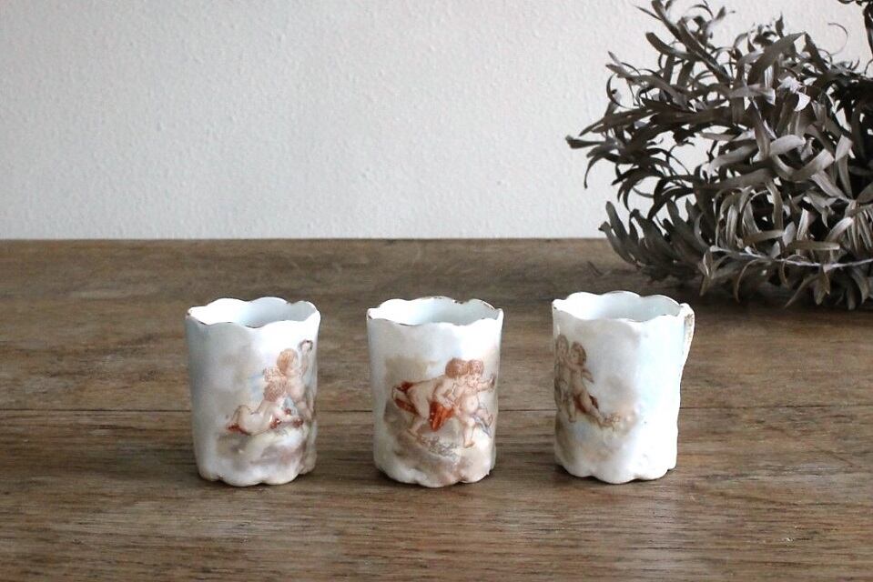 こちらはエンジェルの柄の小さなジャグです。優しい色合いが愛らしいです。ハンドルと注ぎ口の周りに施された金彩にエレガントさも感じられます。シロップやドレッシングを入れたり、テーブルに置いて花を飾ったり、色々と楽しめそうです。価格は一つのお値段です。右側の1点だけ在庫がございます。