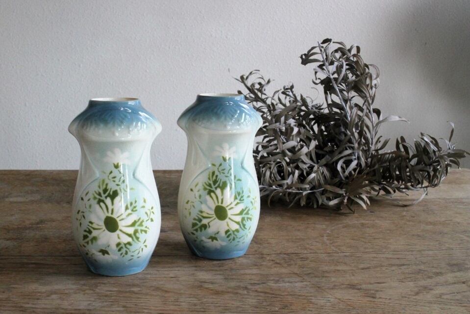 アールヌーボーなデザインにマーガレットの花がステンシルで描かれたフランスのフラワーベースです。淡いブルーのグラデーションが優しい印象です。アンティーク特有の細かい傷はございますが、ヒビや欠けはございません。