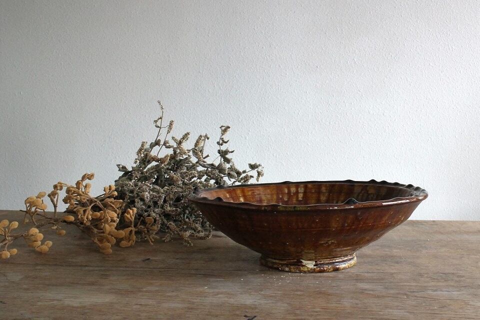 フランスで見つけた茶色の深皿です。流れるような茶色の模様が印象的です。どんなものにも合いそうな色合いです。アンティーク特有の細かい傷などはございますが、ヒビや欠けはございません。