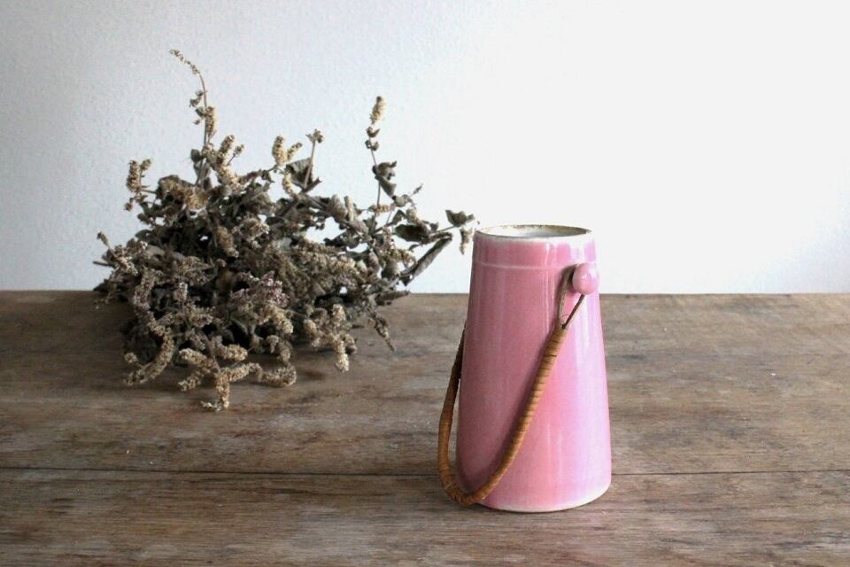 フランスの蚤の市で見つけたピンクの小さな陶器のポットです。もともとは子供のおままごと用のものかもしれません。琺瑯のようなデザインで籐の取っ手が付いているところも、とても可愛らしいです。底の部分にサインがありますが、何が書かれているかは不明です。
