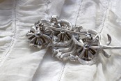 Coroは名高く歴史あるブランドです。1901年CohnとRosenbergerという2人のビジネスマンがニューヨークでアクセサリーブティックを始め、30年代半ばに世界最大のコスチュームジュエリーブランドとなりました。高級志向のコロクラフトと後に別会社となるヴァンドームが有名です。こちらはクリアラインストーンが嵌め込まれたお花モチーフの華やかなブローチです。マットなシルバーカラーがとてもエレガントな印象です。