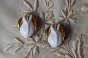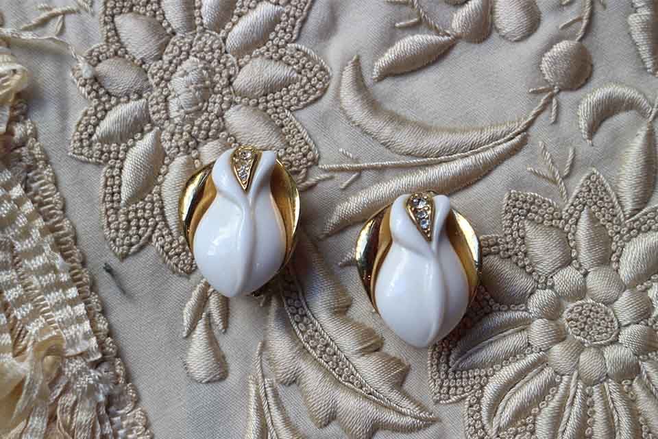 AVONは1886年設立の香水メーカーで、1920年頃からジュエリーの販売が始まりました。こちらはケネス・ジェイ・レーン(1930年~)によって1987年にAVONの為にデザインされたミッドナイトローズコレクションと呼ばれているシリーズのイヤリングです。ケネス・ジェイ・レーンはディオールの靴デザイナーを経て1963年にジュエリー会社を設立しました。顧客には、オードリー.ヘップバーン、ダイアナ妃、大統領夫人などの著名人が名を連ねていました。「K.J.L for AVON」の刻印がございます。