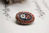 イタリア製のマイクロモザイクブローチです。細かいモザイクガラスが嵌め込まれたマイクロ(ローマン)モザイクは18世紀から続く伝統工芸です。緻密なモザイクガラスのいろいろな色の組み合わせによって作られる柄がとても魅力的です。18世紀から19世紀にイギリス貴族たちの高級土産品として流行りました。現在では世界にコレクターも多く腕利きの職人による繊細なものは美術工芸品として高額で取引されています。アンティーク特有の細かい傷がございますが、新しいものには無い年月を経て刻まれた奥深い味わいとして感じて頂きたいです。こちらは赤と白の花の周りに朱色のモザイクが嵌められたデザインです。よく見ると花びらは2色で作られています。