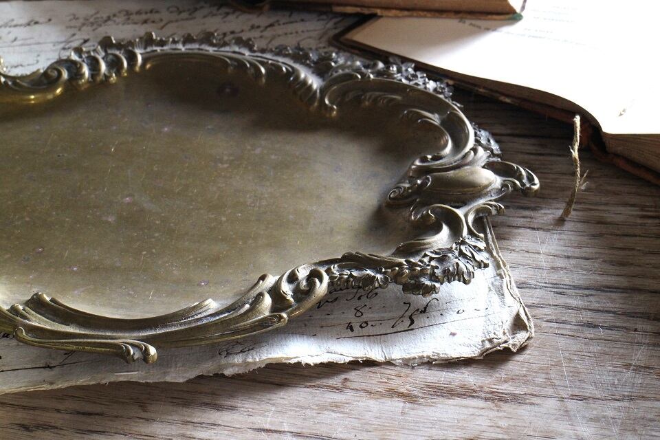 ロカイユ柄が美しいフランスのブロンズトレイです。厚みがありずっしりとしています。アンティーク特有の細かい傷はございますが、ヒビや欠けはございません。